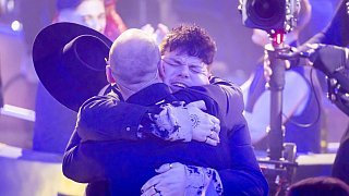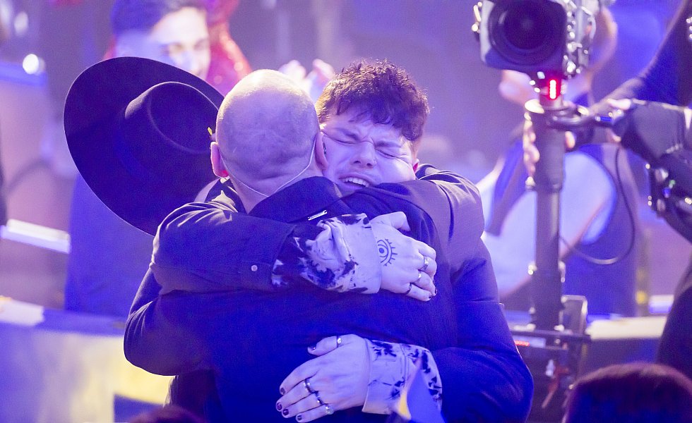 Isaak (r.), Gewinner des deutschen ESC-Vorentscheids, umarmt Max Mutzke beim Eurovision Song Contest.