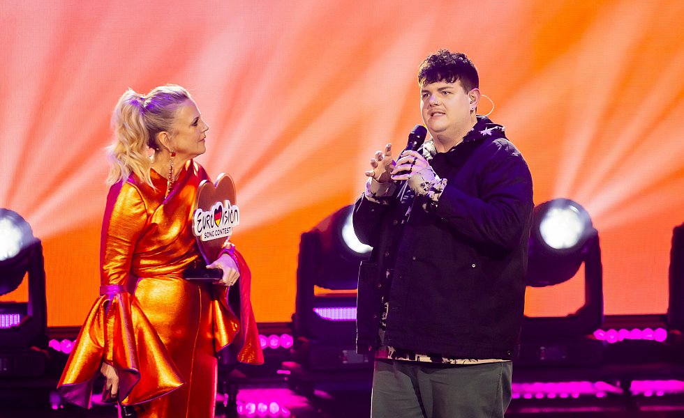 Isaak, Gewinner des deutschen ESC-Vorentscheids, steht neben Barbara Schöneberger, Moderatorin, beim Eurovision Song Contest.