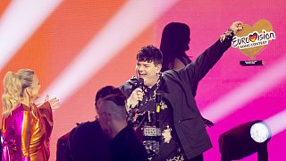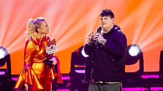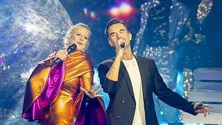 Isaak (M.), Gewinner des deutschen ESC-Vorentscheids, jubelt neben Barbara Schöneberger (l.), Moderatorin, beim Eurovision Song Contest.