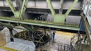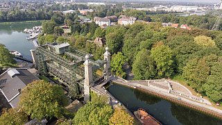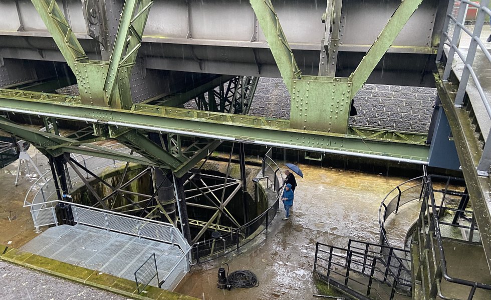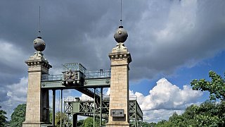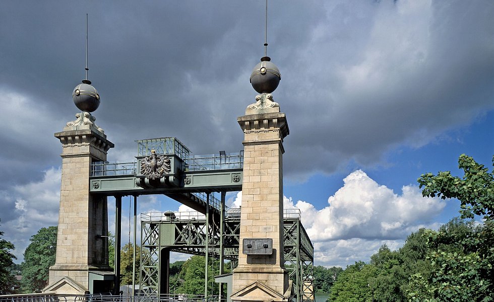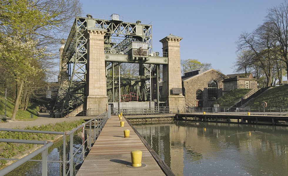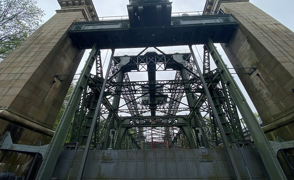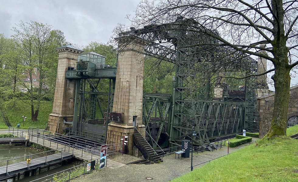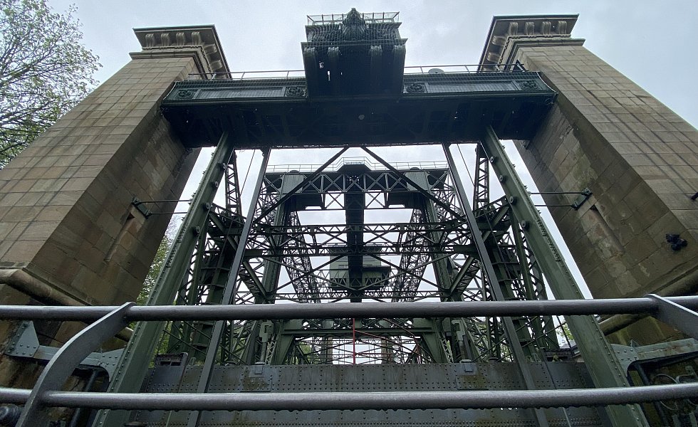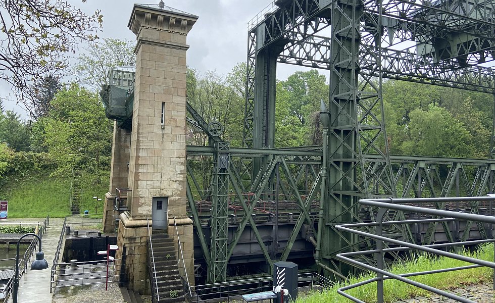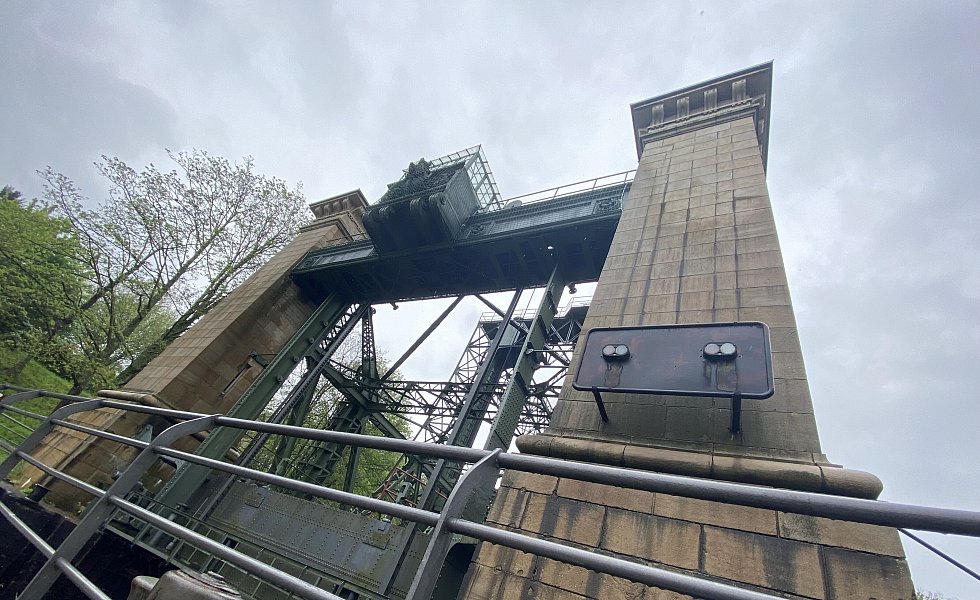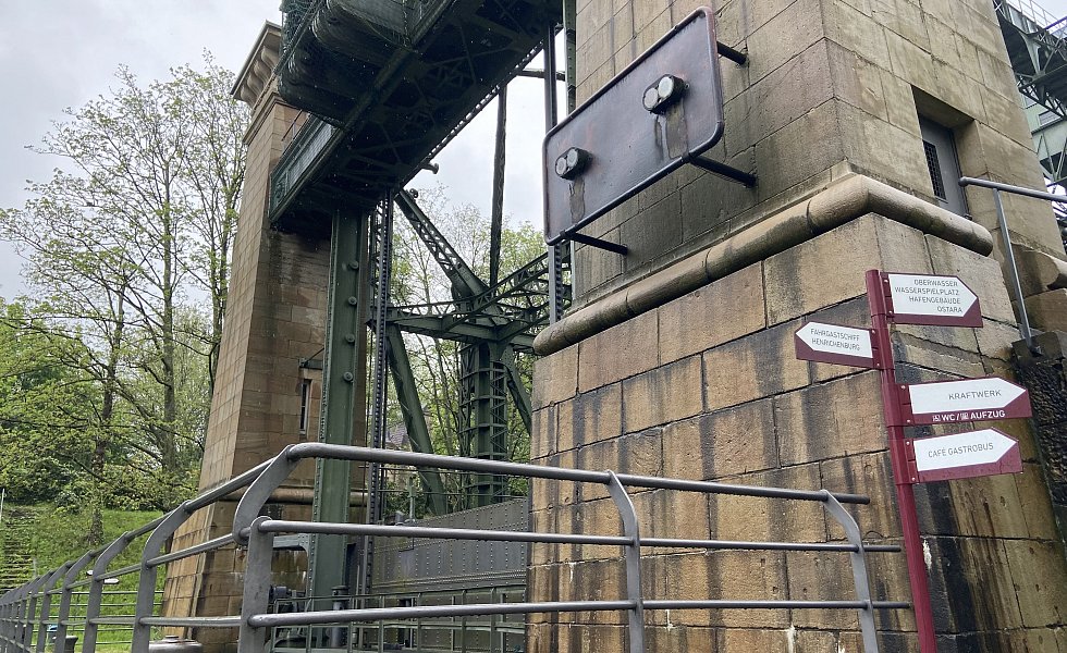 Das Hebewerk besteht aus einer Stahlkonstruktion und einer Stein-Architektur.