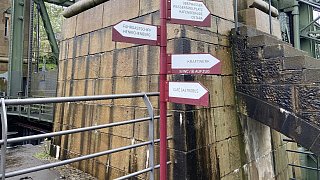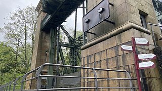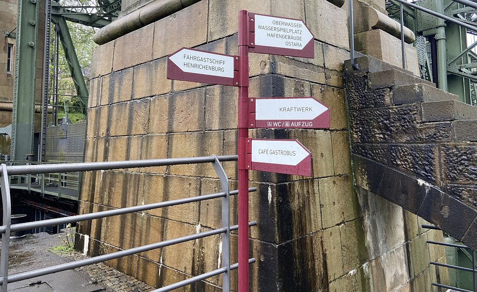 Mit Wegweisern finden Besucherinnen und Besucher ihren Weg zu den verschiedenen Stationen des Schiffshebewerks.