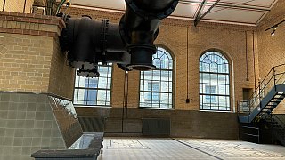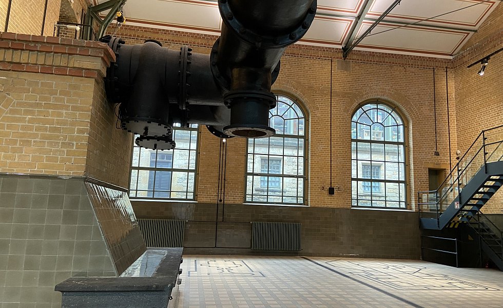 Die alten Dampfrohre stehen noch. Markierungen auf dem Boden erinnern an die Dampfmaschinen, die den Strom für die Pumpen erzeugt haben.
