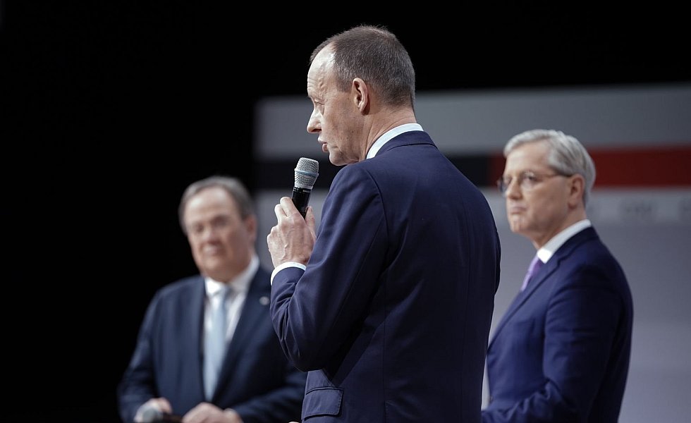 Friedrich Merz spricht auf dem digitalen CDU-Bundesparteitag. Im Hintergrund Norbert Röttgen (r) und Armin Laschet.