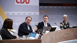 Die CDU-BUndestagsabgeordnete Yvonne Magwas, Armin Laschet, Generalsekretär Paul Ziemiak und Parteivize Silvia breher auf dem Podium in Berlin.