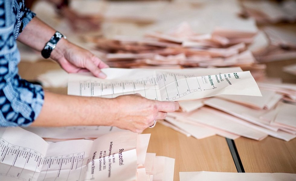 Wahlhelferinnen und ein Wahlhelfer entleeren im niedersächsischen Delmenhorst eine Wahlurne mit Stimmzetteln.