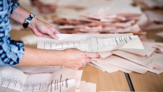 Eine Wahlhelferin sortiert in einer Grundschule die Stimmzettel für die Auszählung.