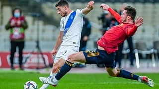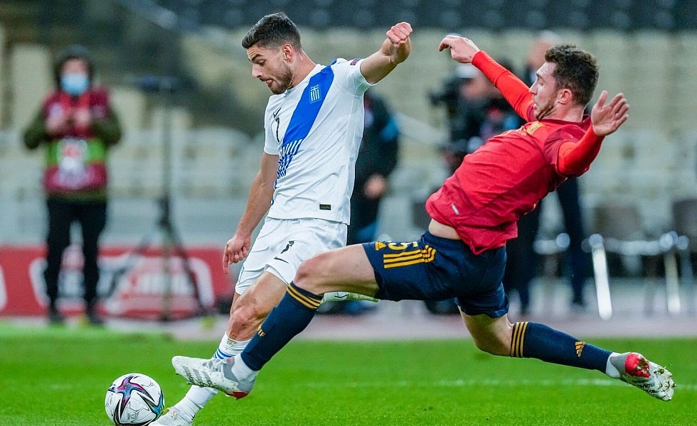Griechenlands Giorgos Masouras (l) wird vom Spanier Aymeric Laporte attackiert.