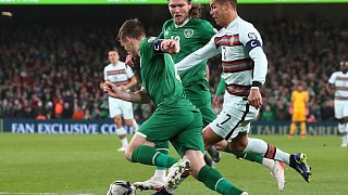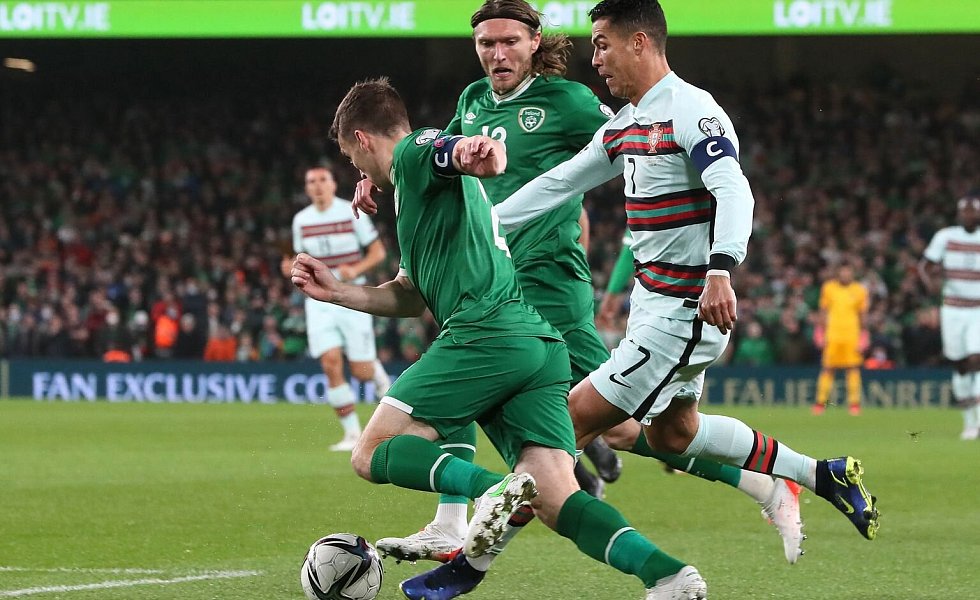 Die Iren Seamus Coleman (l) und Jeff Hendrick (hinten) doppeln Cristiano Ronaldo.