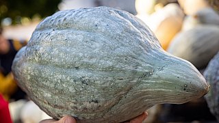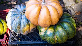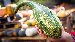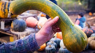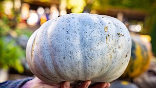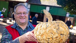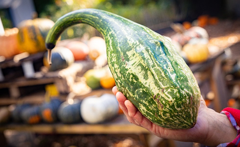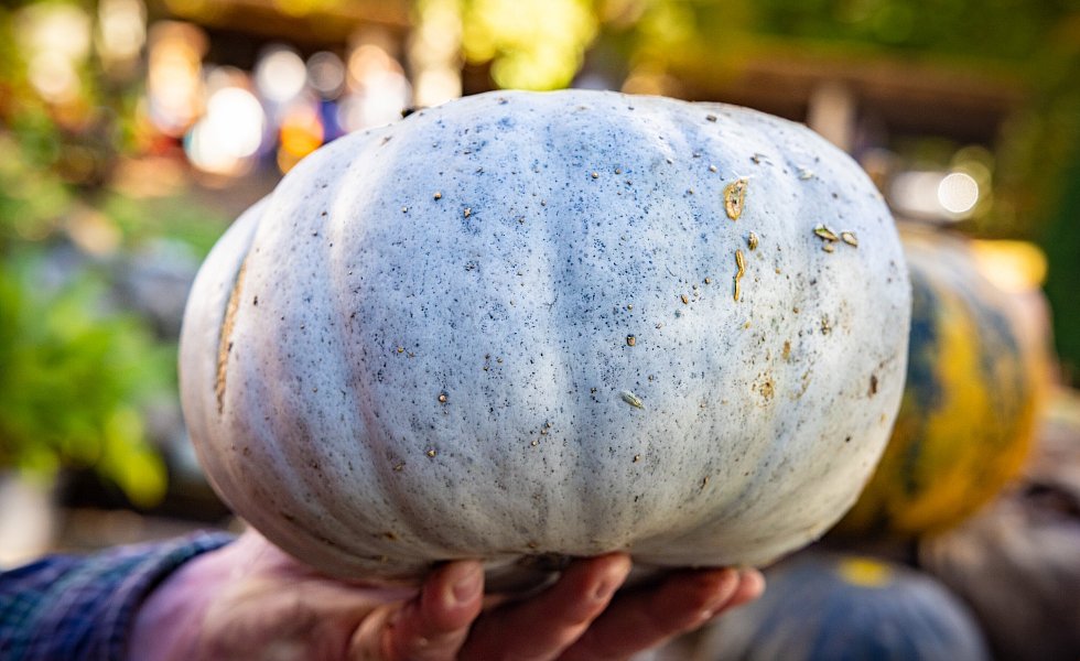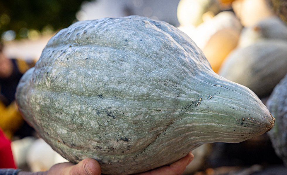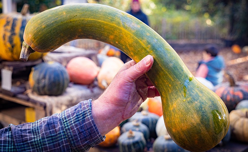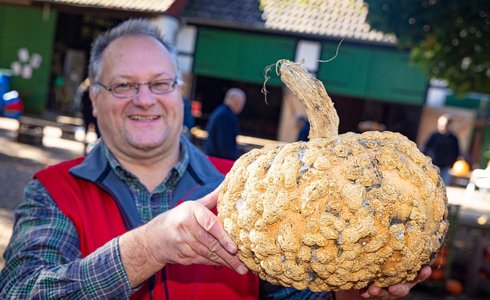 Delef Krüger mit einem Erdnuss-Kürbis (Galeux d'Eysines).