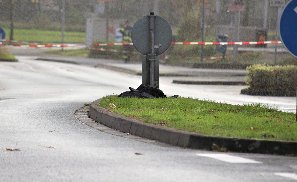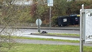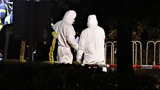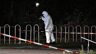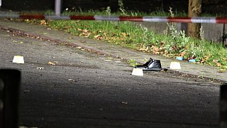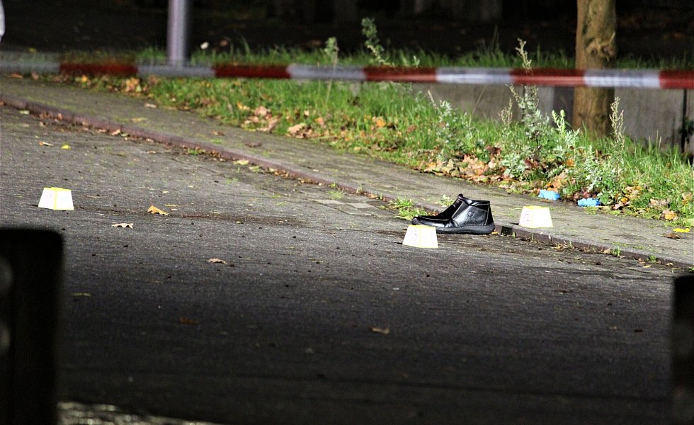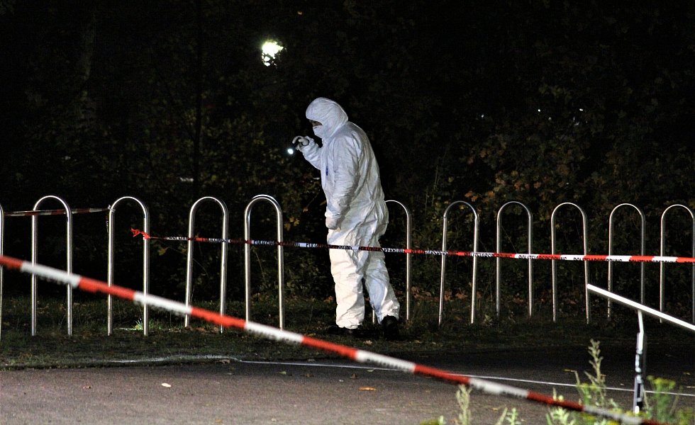 Beamte der Kriminaltechnischen Untersuchung (KTU) inspizierten bis in den späten Sonntagabend den Ort, an dem Polizisten einen Mann ins Bein schossen, der zuvor mit einer Handgranate gedroht haben soll.