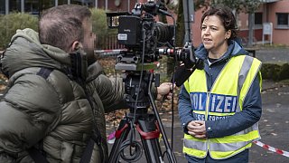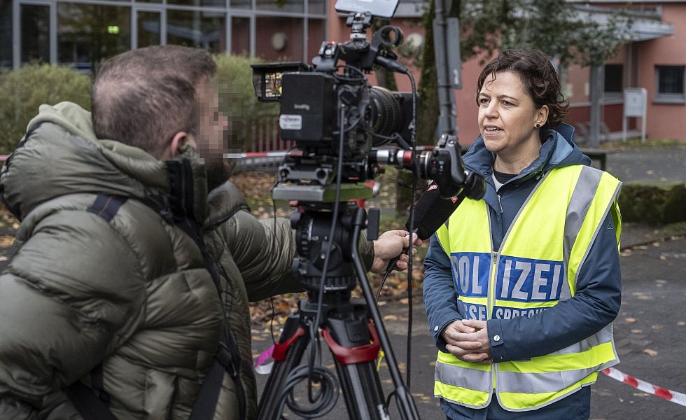 Polizeisprecherin Sarah Siedschlag gibt einem TV-Team in Sennestadt ein Interview.