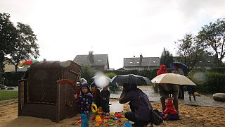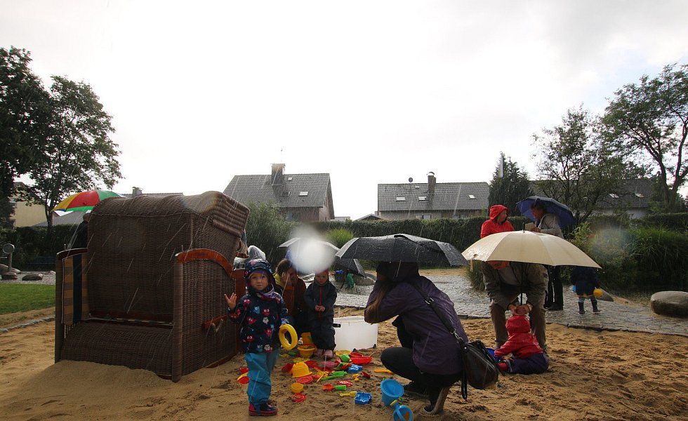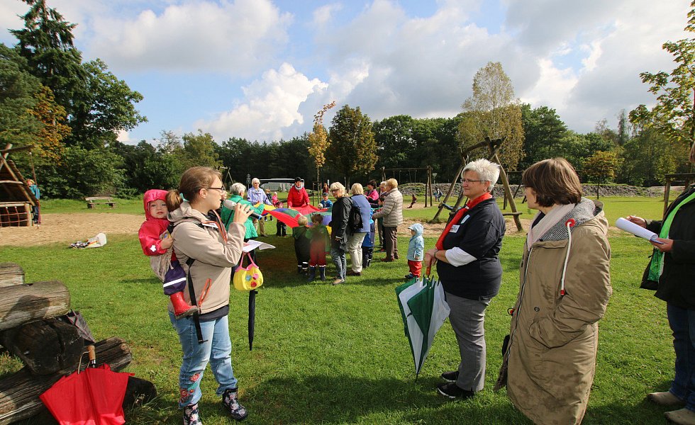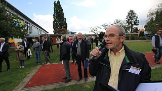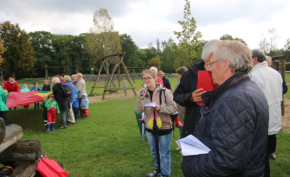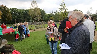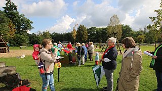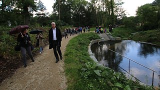 Zur Wapelaue: Jürgen Kerstingtombroke (r.) führt die Bewertungskommission und Zuschauer über den Schulhof hin zur neugestalteten Wapelaue.