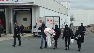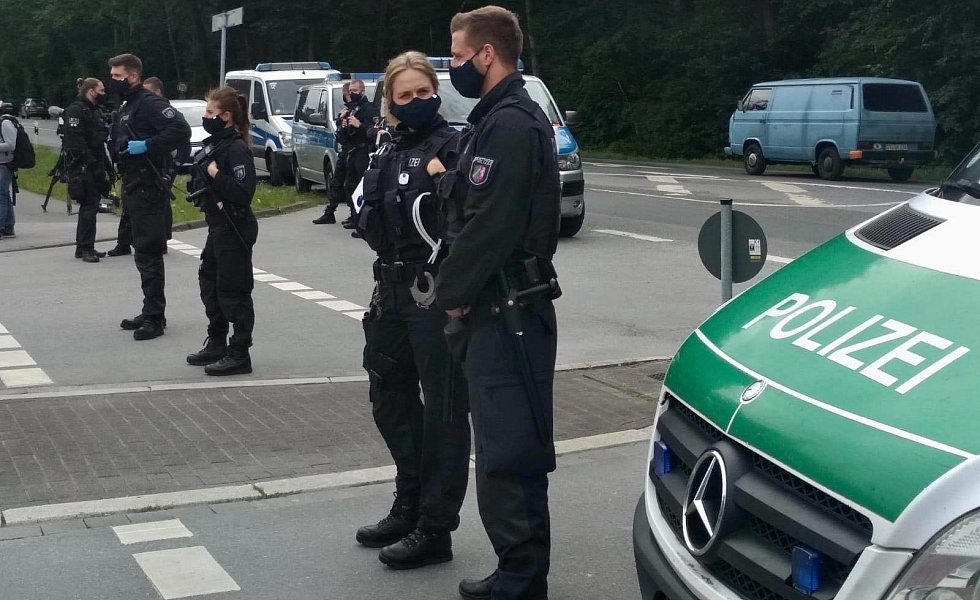 Die Polizei eskortiert die vermummten Aktivisten vom Dach des Tönnies-Werks zu den anderen Protestlern.