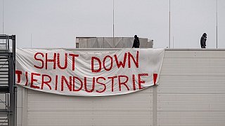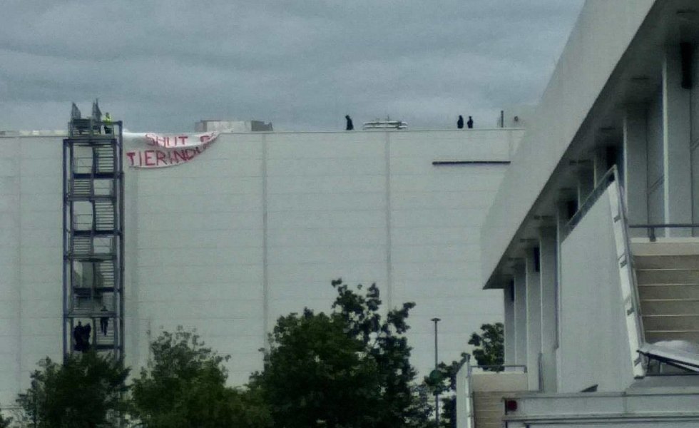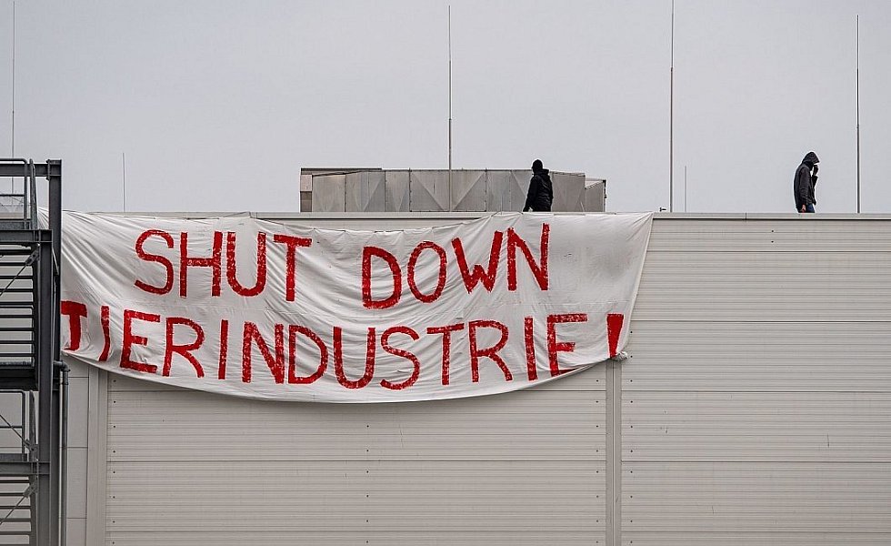 Das Plakat mit "Shutdown Tierindustrie" haben die Aktivisten vom Dach des Werkes abgerollt.