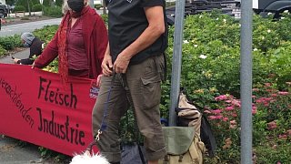 Aktivisten des "Bündnis gegen die Tierindustrie" haben sich am Samstagvormittag am Tönnies-Schlachthof in Rheda-Wiedenbrück positioniert. Sie fordern dessen dauerhafte Schließung.
