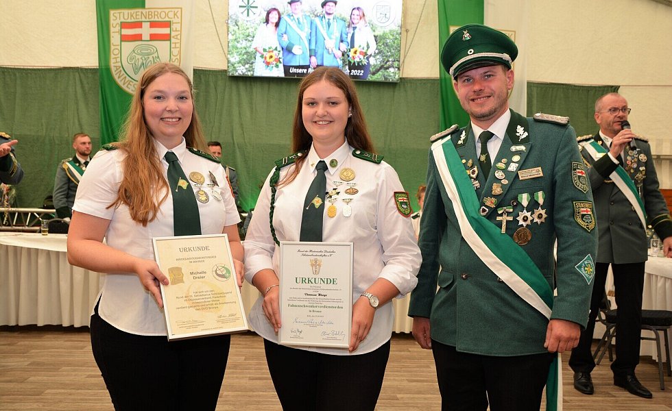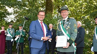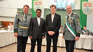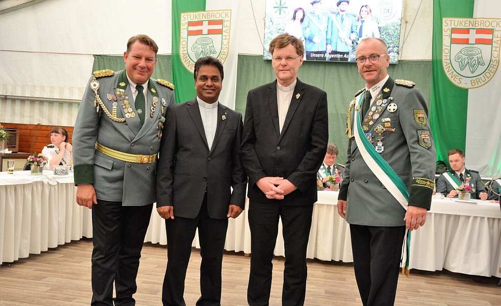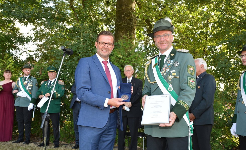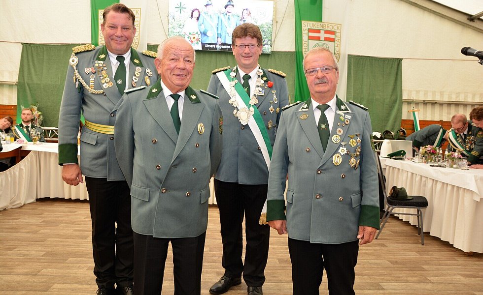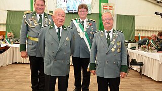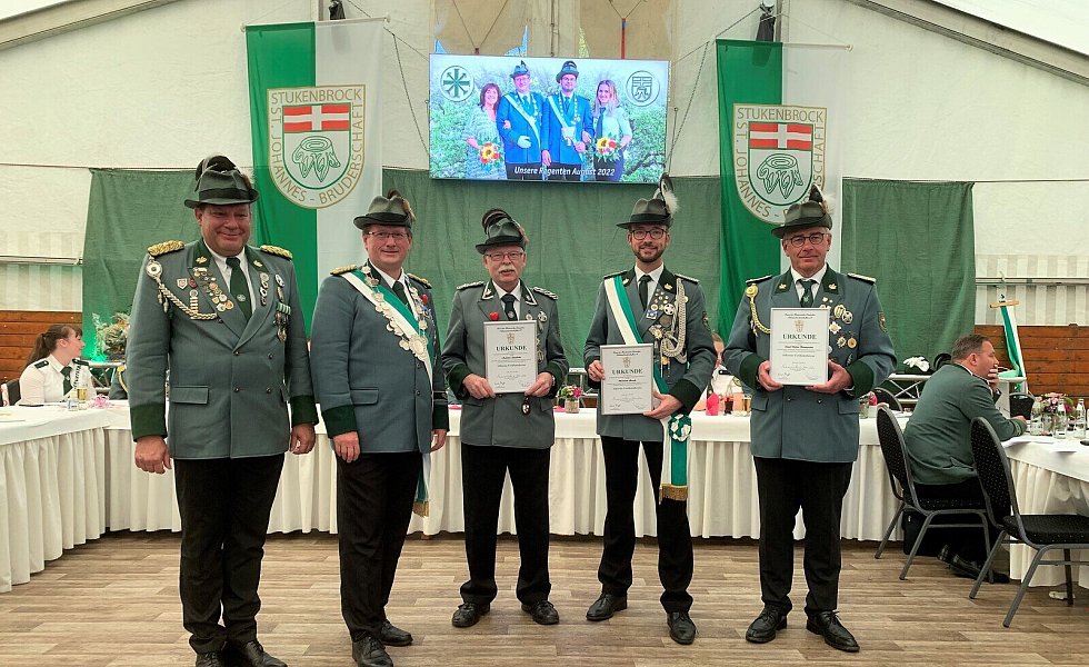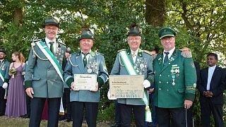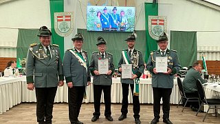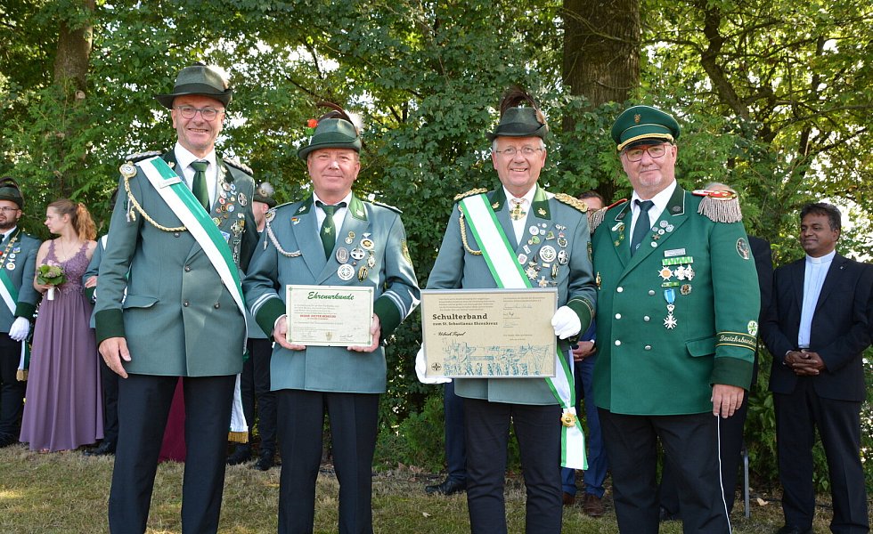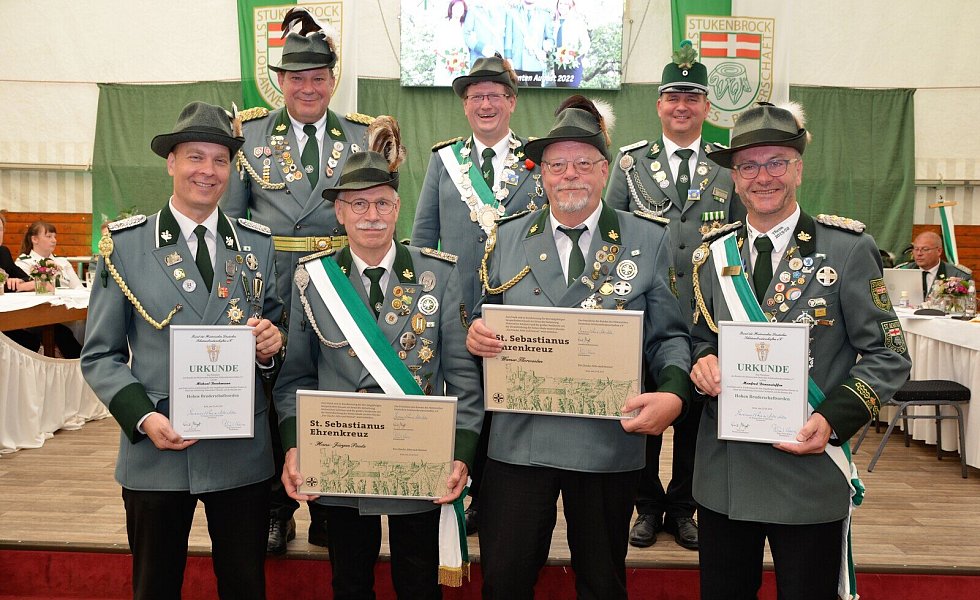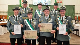 Michael Brechmann (l.) und Manfred Bonensteffen (r.) sind mit dem Hohen Bruderschaftsorden, Hans-Jürgen Pautz (2. v. l.) und Werner Thorwesten mit dem St.-Sebastianus-Ehrenkreuz ausgezeichnet worden. Hinter ihnen stehen v. l. Oberst Kai Schmidt, König Ulrich Potthoff und Bezirksbundesmeister David Steffens.