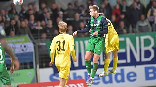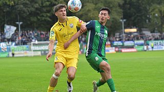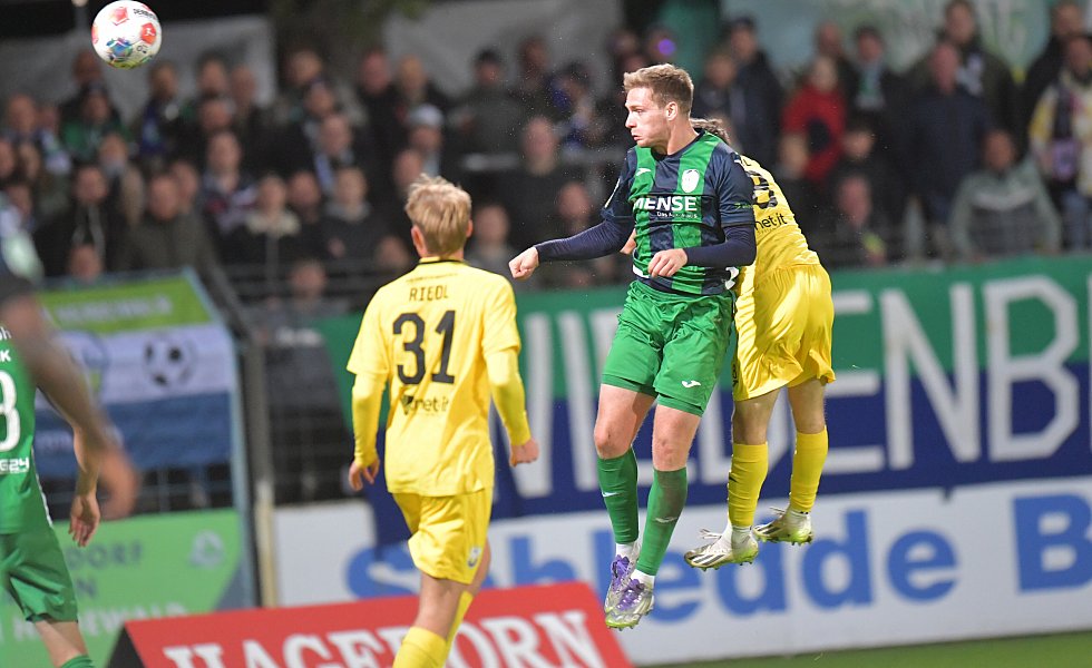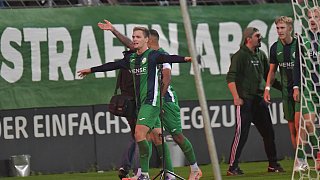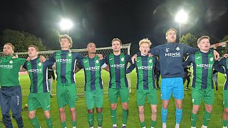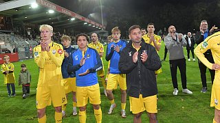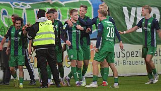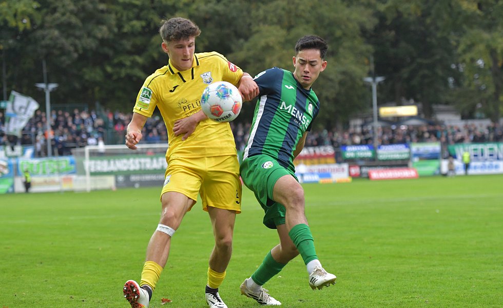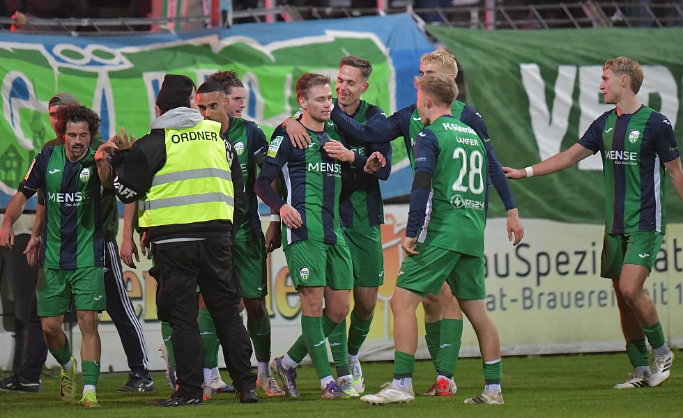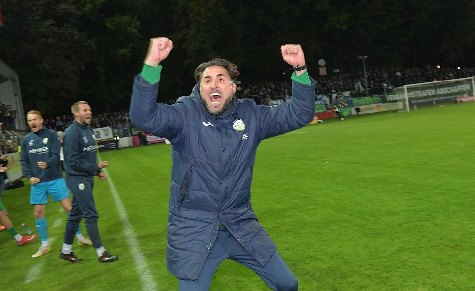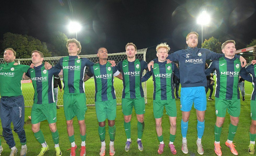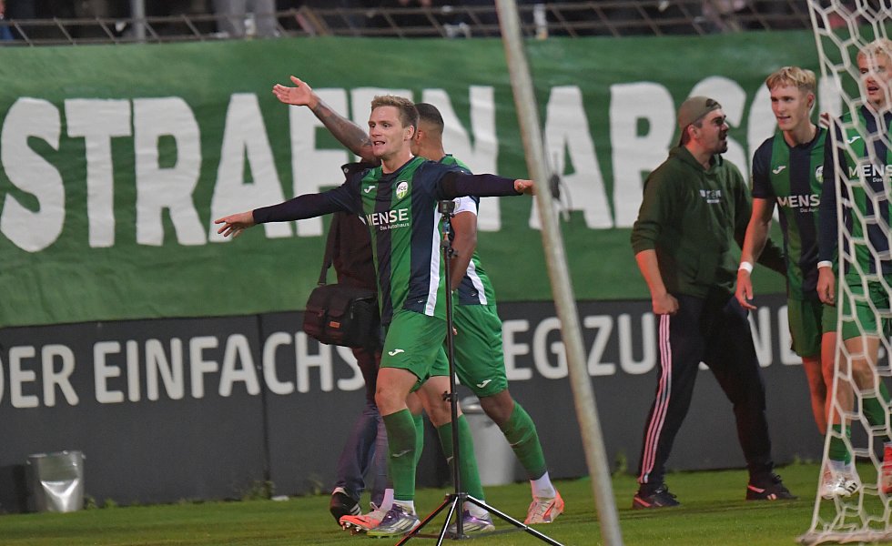 Fertigmachen zum Jubeln: Soeben hat Jan-Lukas Liehr (v.) das Siegtor zum 1:0 im Derby in der Fußball-Regionalliga West zwischen dem FC Gütersloh und SC Wiedenbrück markiert. Der Mittelfeldspieler genießt diesen Moment mit den Fans des FCG – denkt aber danach auch an seinen Ex-Klub SCW.