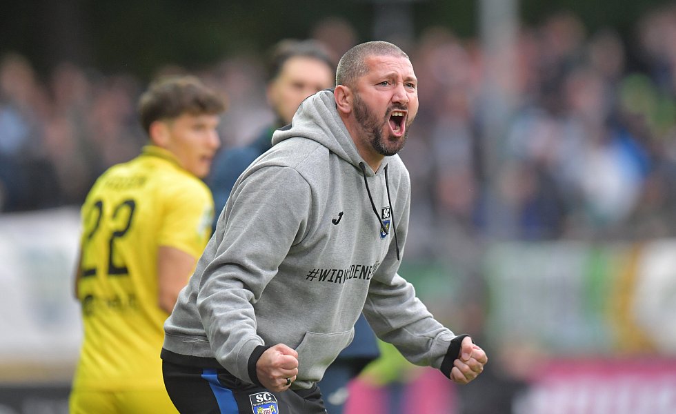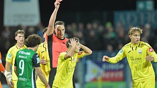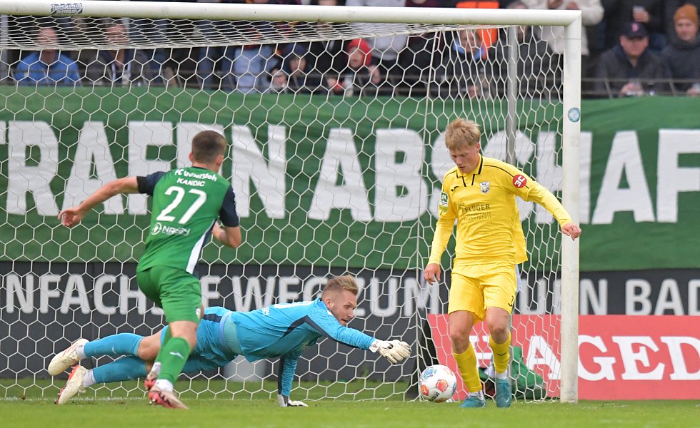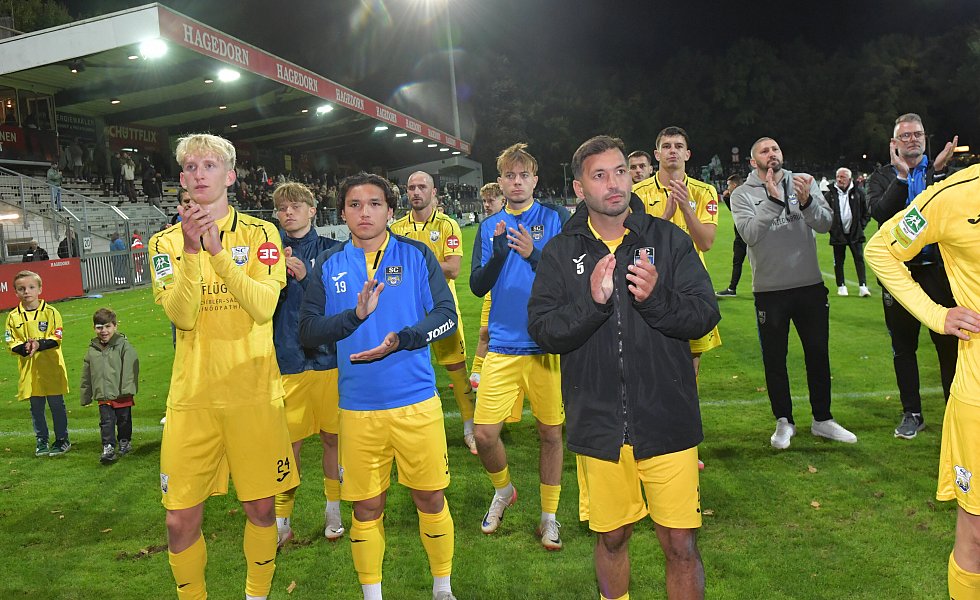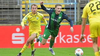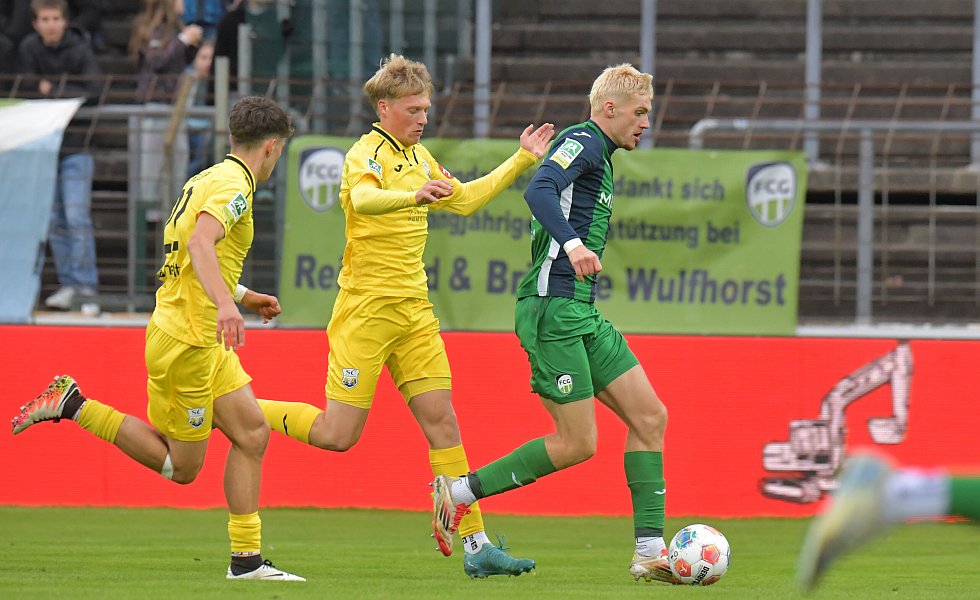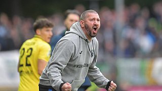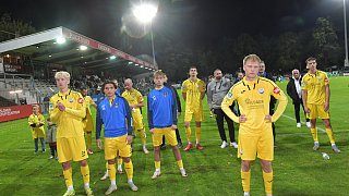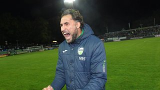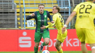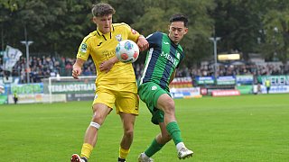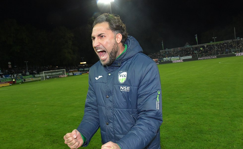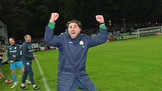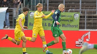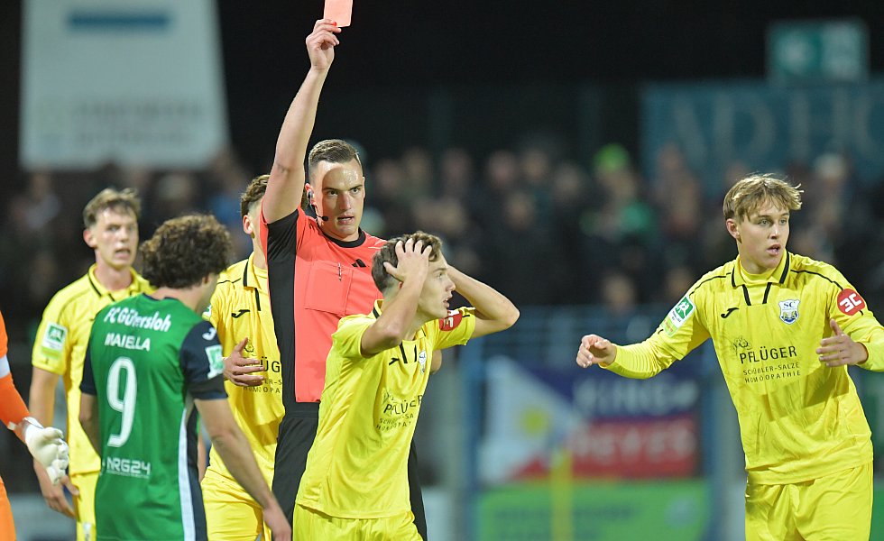 Fertigmachen zum Jubeln: Soeben hat Jan-Lukas Liehr (v.) das Siegtor zum 1:0 im Derby in der Fußball-Regionalliga West zwischen dem FC Gütersloh und SC Wiedenbrück markiert. Der Mittelfeldspieler genießt diesen Moment mit den Fans des FCG – denkt aber danach auch an seinen Ex-Klub SCW.