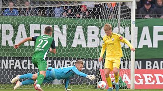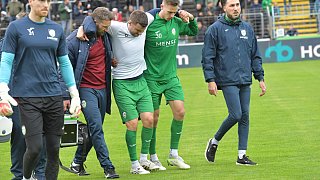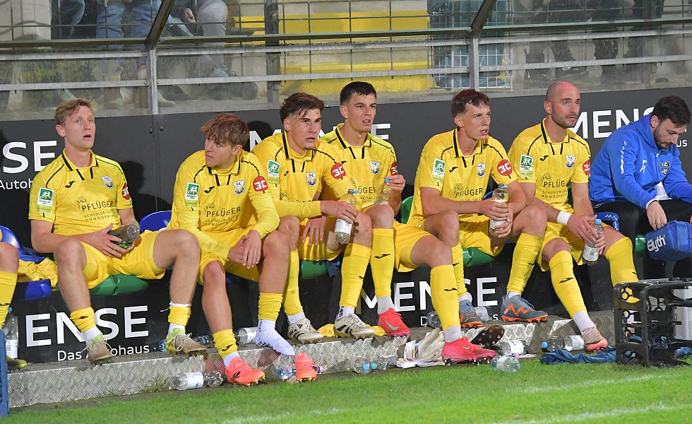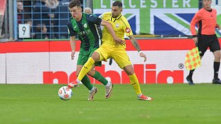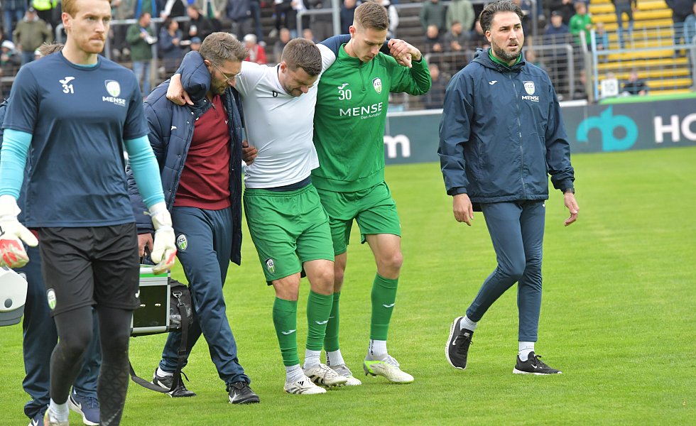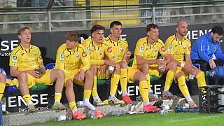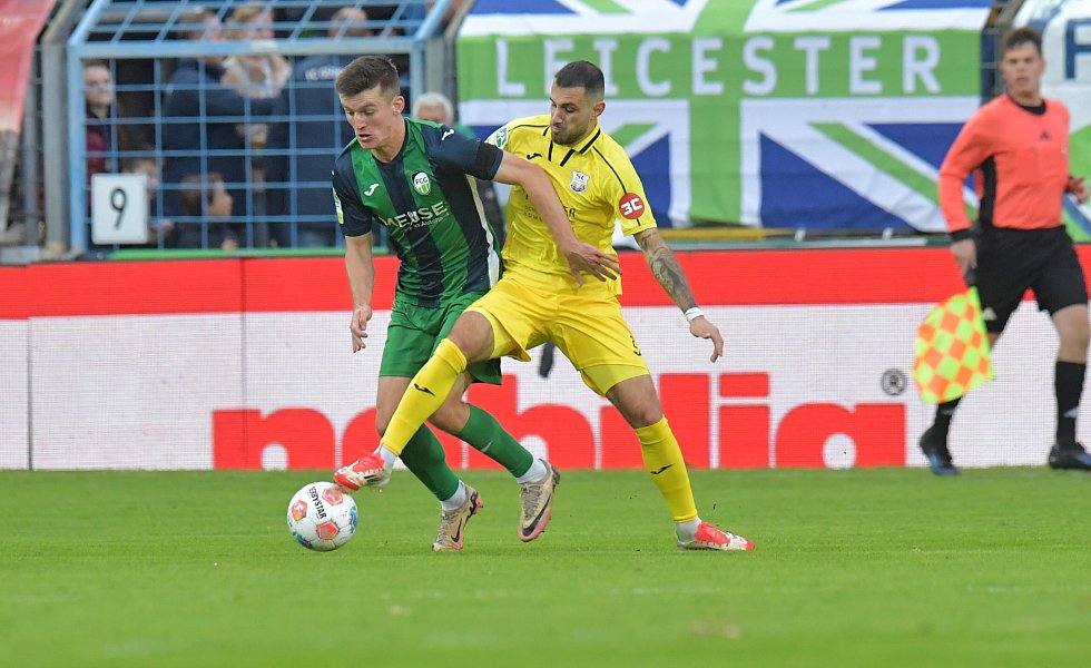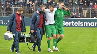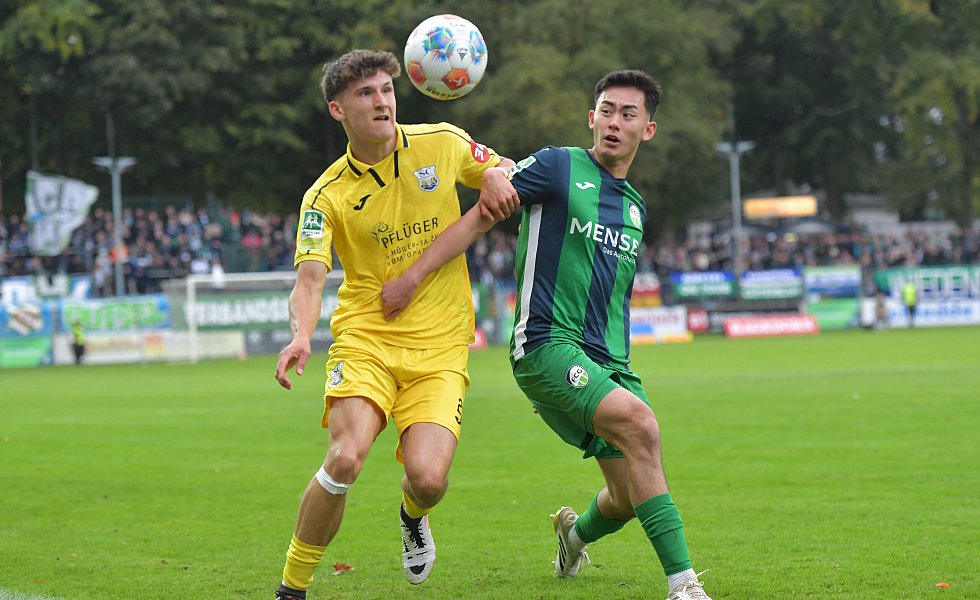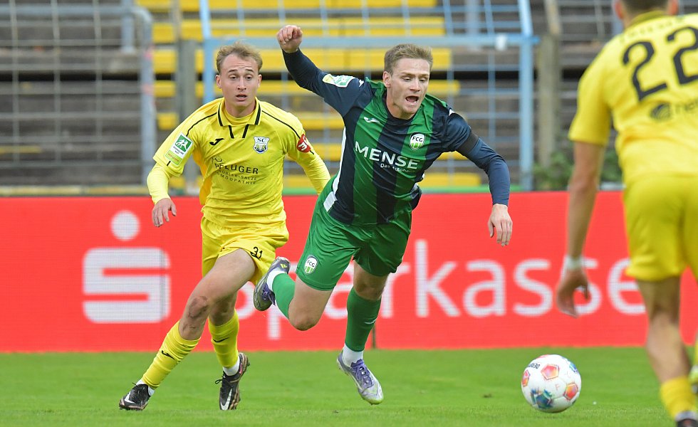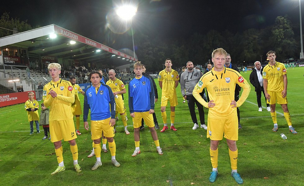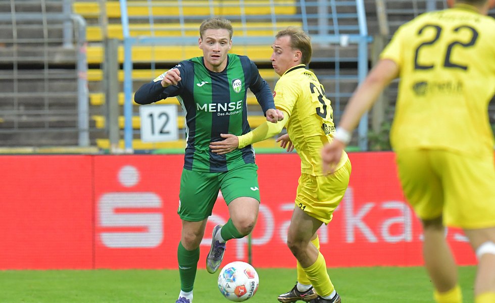 Fertigmachen zum Jubeln: Soeben hat Jan-Lukas Liehr (v.) das Siegtor zum 1:0 im Derby in der Fußball-Regionalliga West zwischen dem FC Gütersloh und SC Wiedenbrück markiert. Der Mittelfeldspieler genießt diesen Moment mit den Fans des FCG – denkt aber danach auch an seinen Ex-Klub SCW.