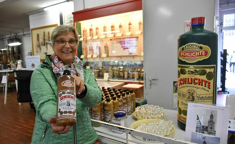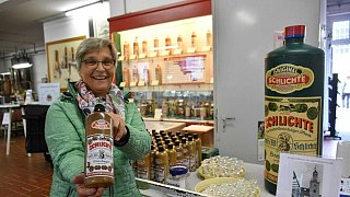 Rosemarie Nölle vom Historischen Museum präsentiert den Aktions-Steinhäger.