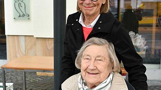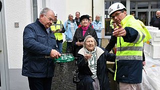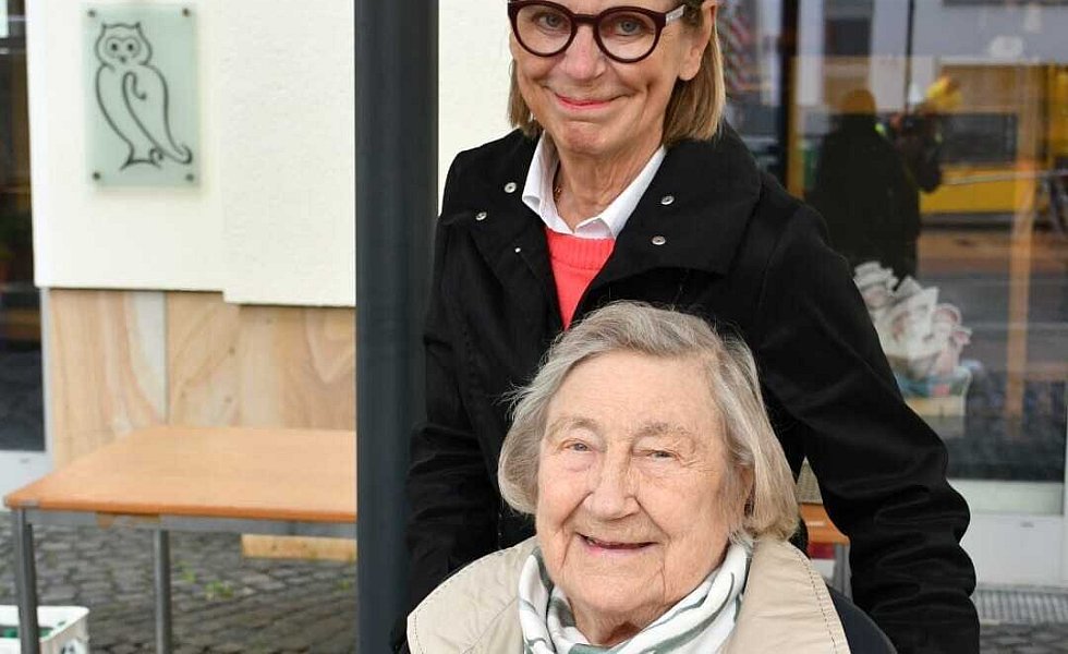 Barbara und Winifred Schlichte beobachten die Aufstellung der neuen Kruke in Steinhagen.