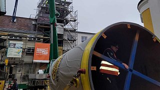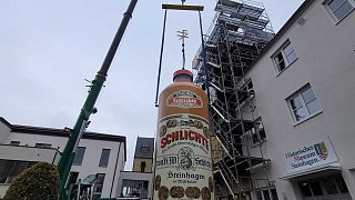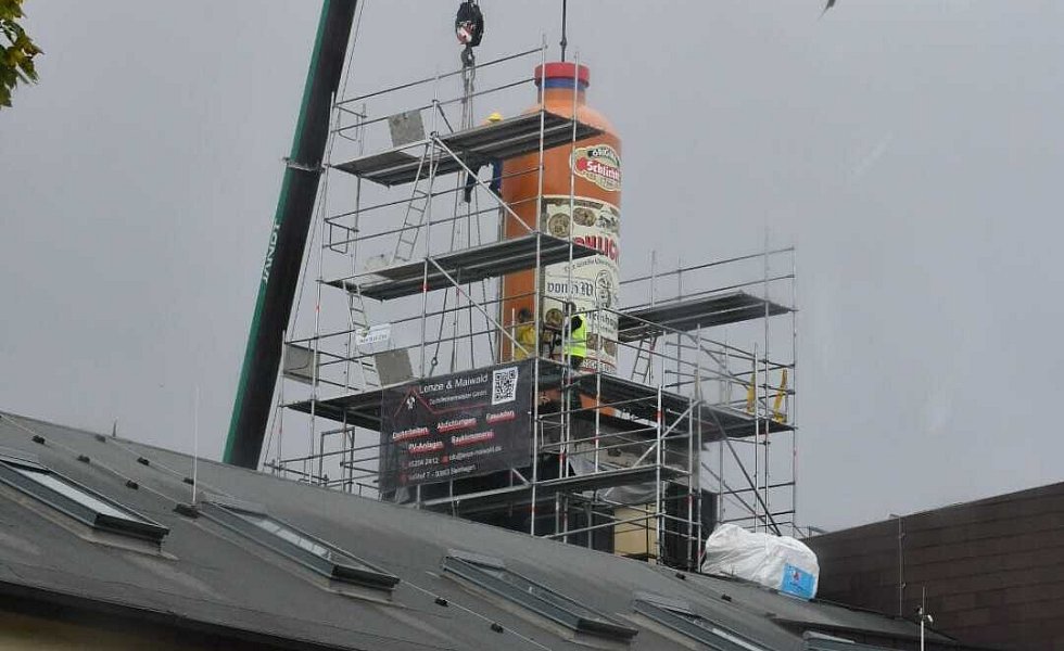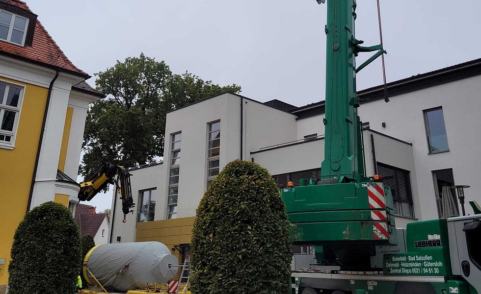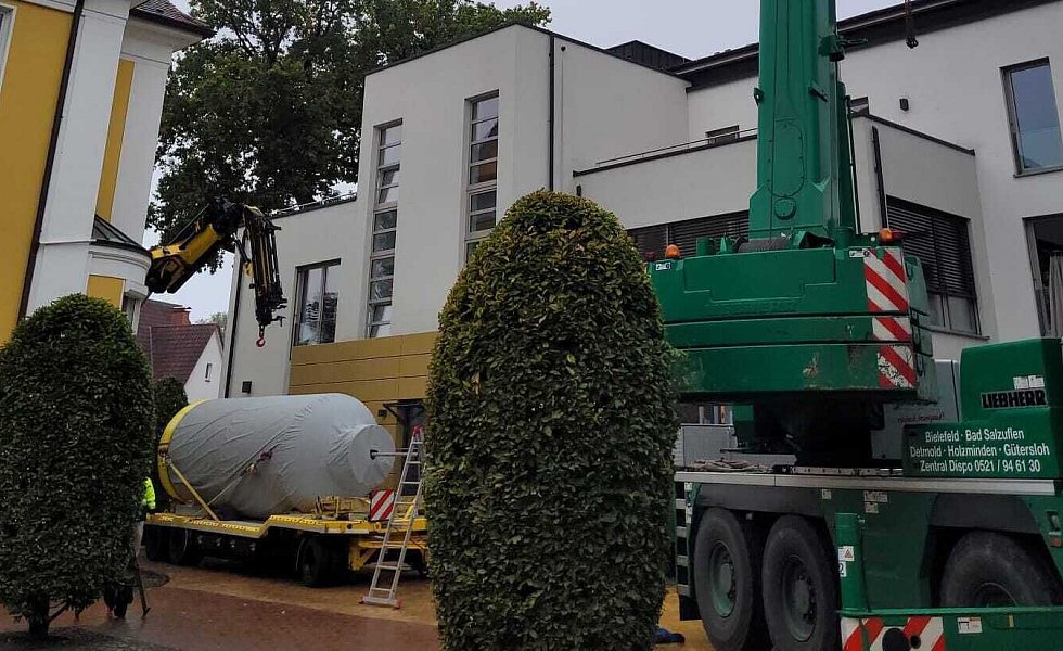 Die neue Kruke wird mit einem Spezialkran aufs Dach der Brennerei im Kreis Gütersloh gehoben.