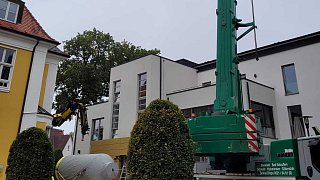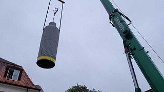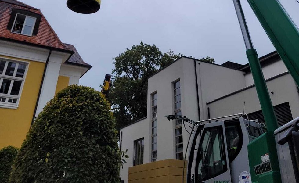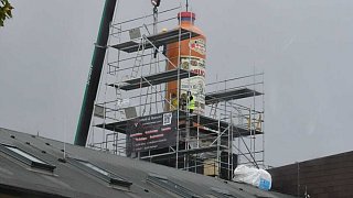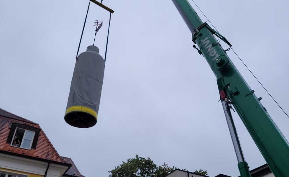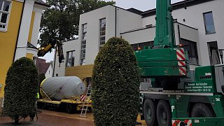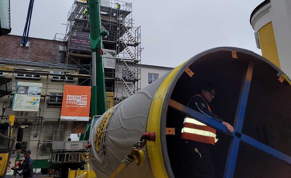 Die neue Kruke wird mit einem Kran auf das Dach des Schlichte-Carrees in Steinhagen gehoben und ersetzt das alte Wahrzeichen.