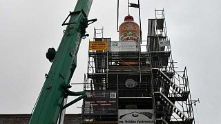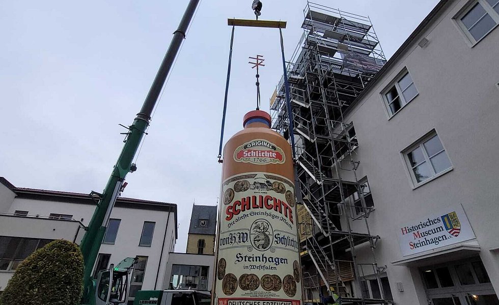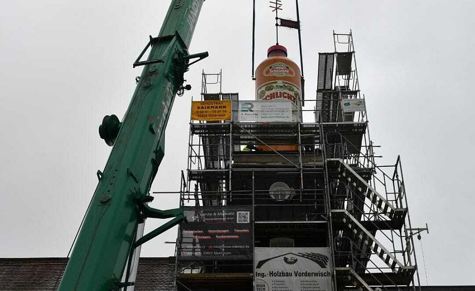 Die neue Steinhäger-Kruke erstrahlt auf ihrem Turm im Zentrum von Steinhagen.