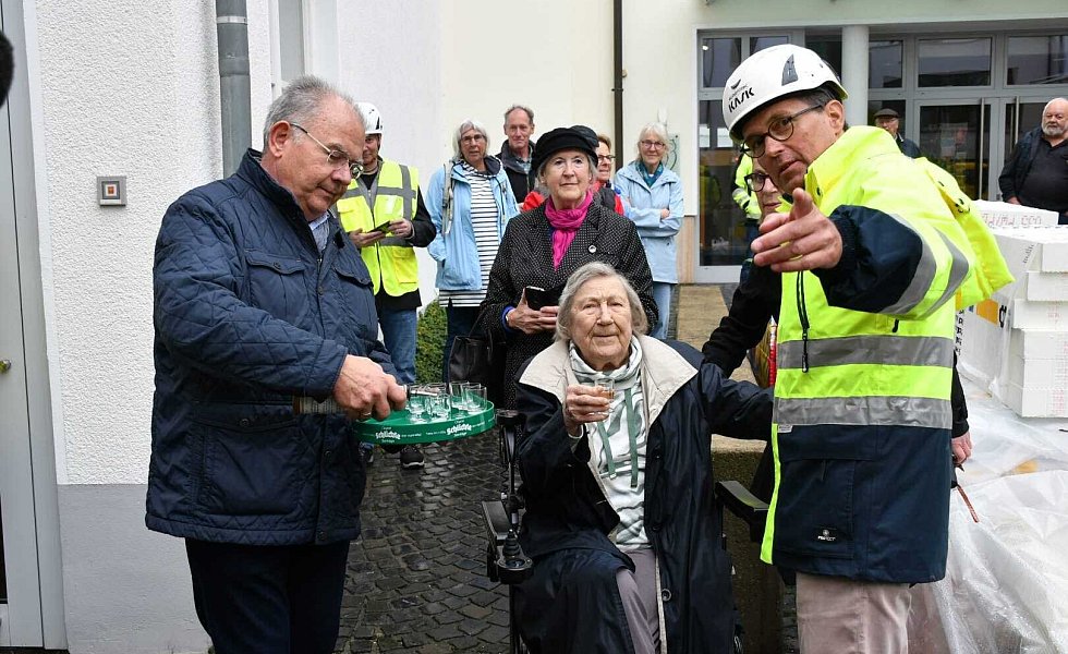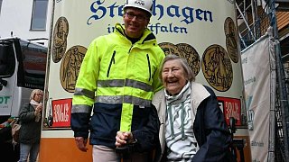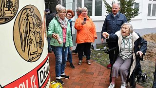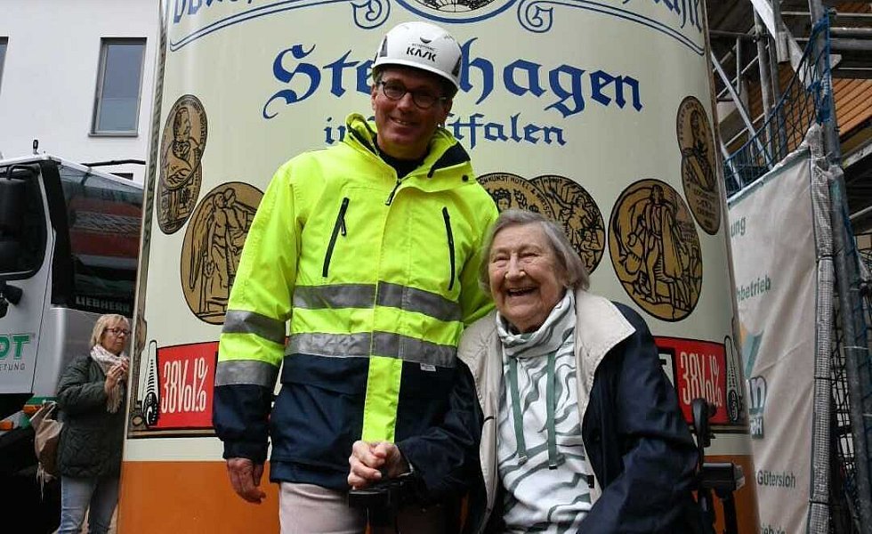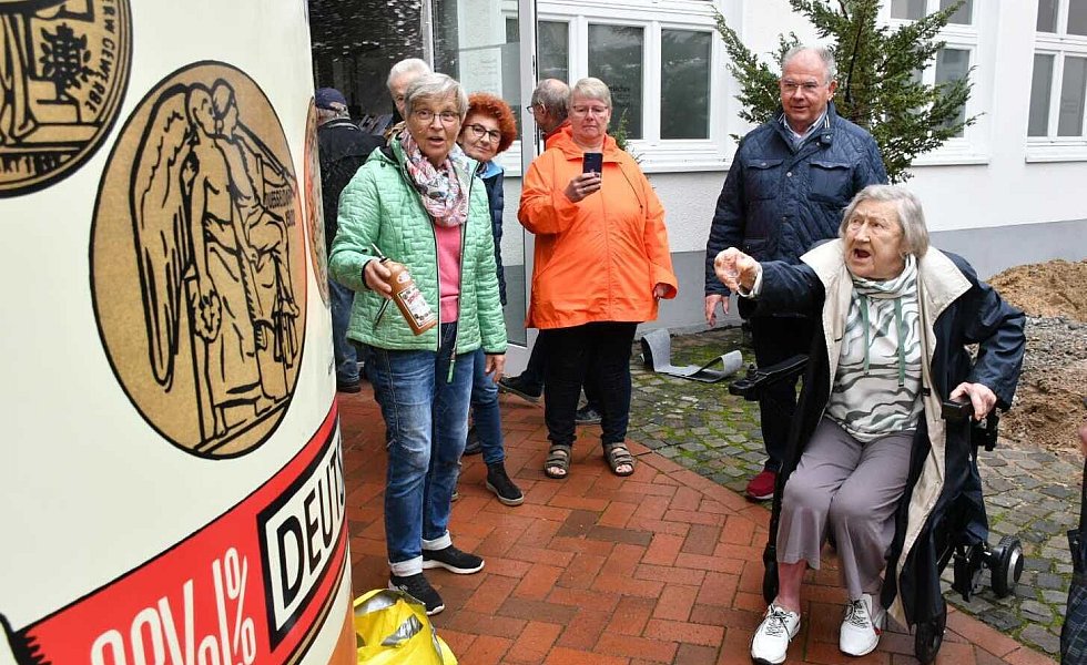 Typisch Steinhagen: Mit einer schwungvollen Steinhäger-Schnaps-Taufe weite Brennerei-Erbin Winifred Schlichte (97) die neue Riesen-Kruke ein.