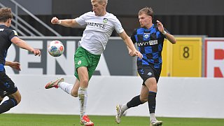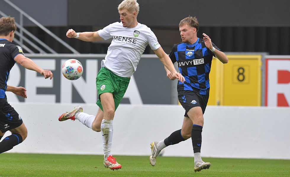 Elegante Ballmitnahme von Luis Frieling. Am Ende siegt der FC Gütersloh in Paderborn und ist nun Tabellenführer in der Regionalliga.