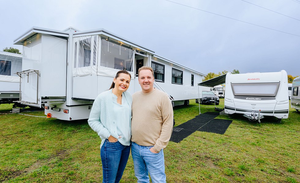 Nadine und Manuel Welte leben während Pollhans mit ihren Kindern Gino (10) und Manuel (15) in einem Luxus-Wohnwagen im Kreis Gütersloh.