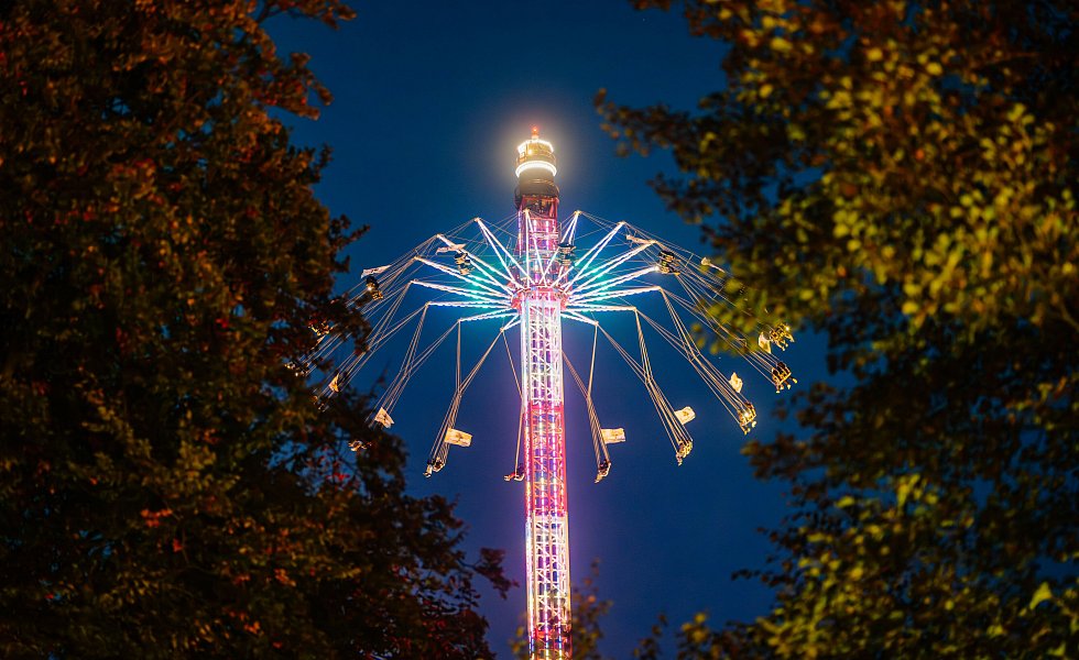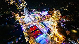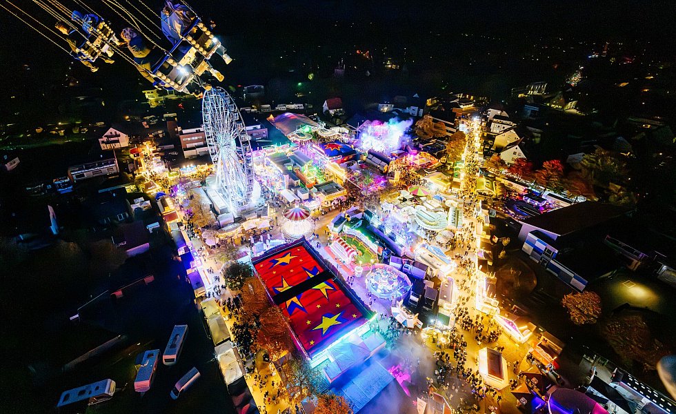 Der Blick von oben auf das funkelnde Pollhans-Gelände bei Nacht.