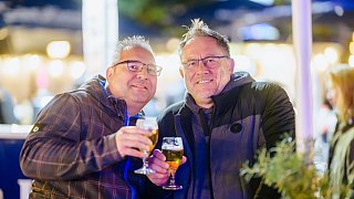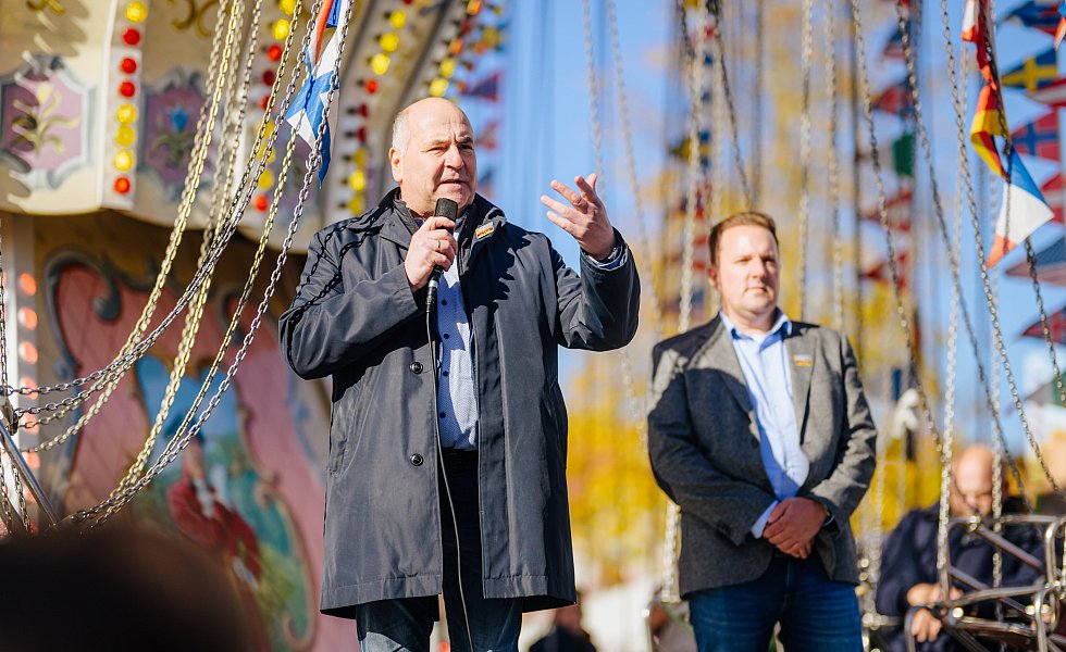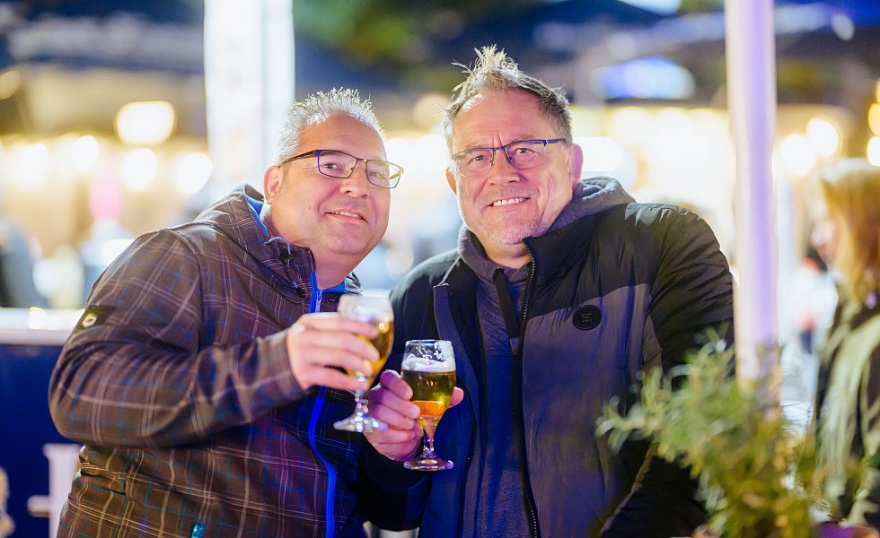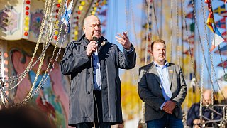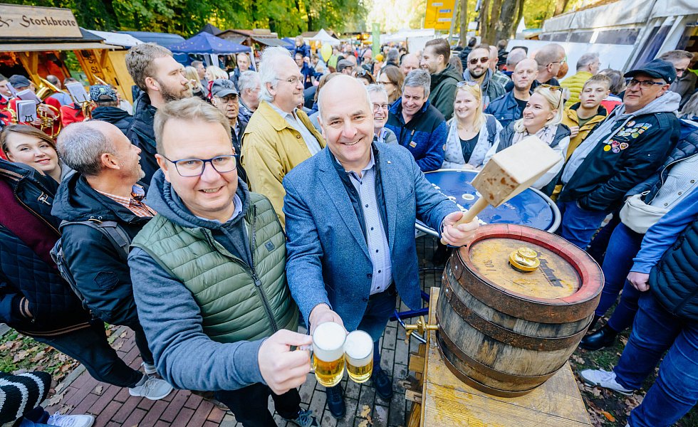 Bürgermeister Hubert Erichlandwehr (l.) und der neu gewählte Schausteller-Sprecher Manuel Welte begrüßen am Samstag die ersten Pollhans-Gäste – bei allerbestem Wetter.