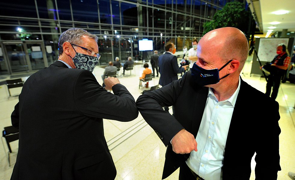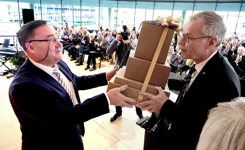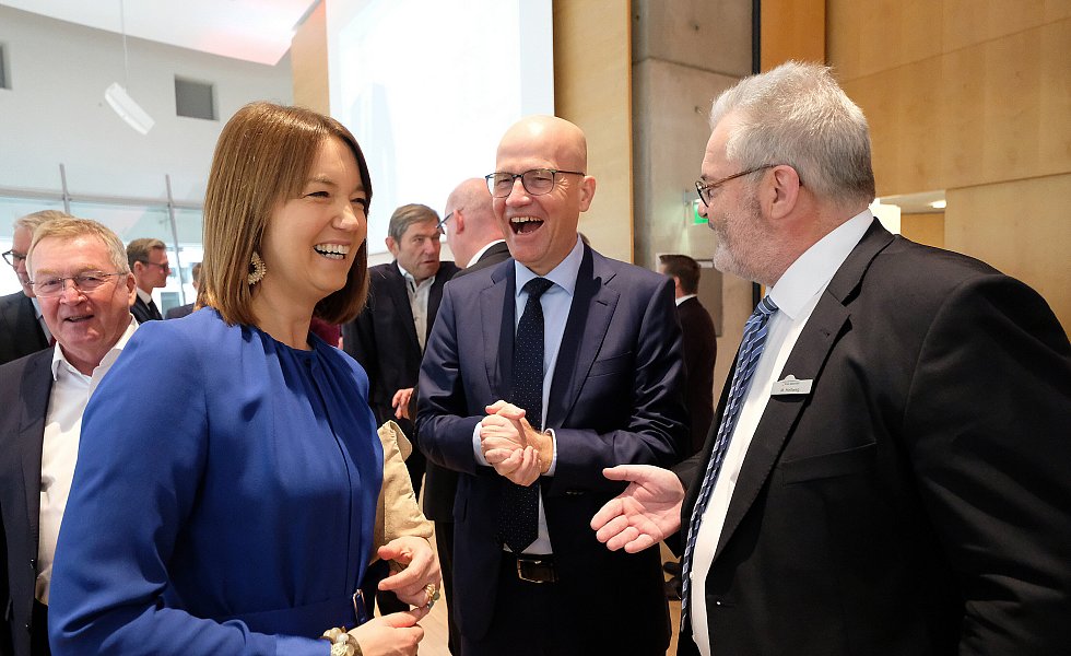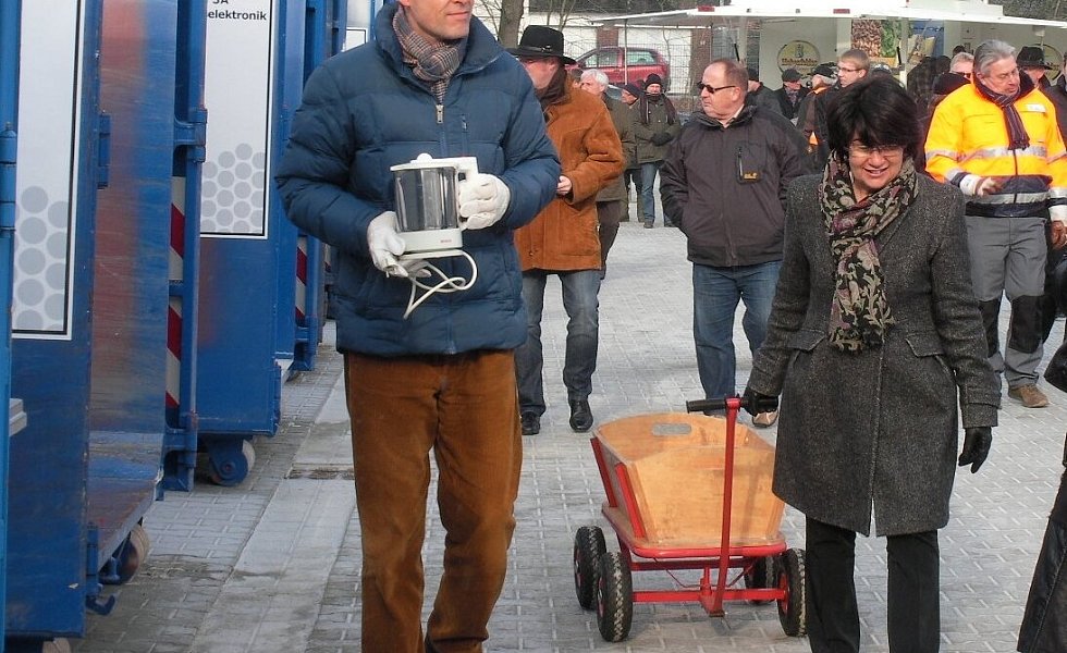 Offizielle Eröffnungsfeier des Entsorgungspunktes Gütersloh // BUZ: Anbei ein Foto von der Entsorgungs-Runde, die Landrat Sven-Georg Adenauer und Bürgermeisterin Maria Unger drehten. Traditionell werden die Offiziellen bei der Einweihung neuer Entsorgungspunkte darum gebeten, den Inhalt eines vorbereiteten Bollerwagens zu entsorgen. Dieser Bitte kamen Adenauer und Unger gerne nach und überzeugten sich so vom kundenfreundlich angelegten Entsorgungspunkt.