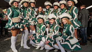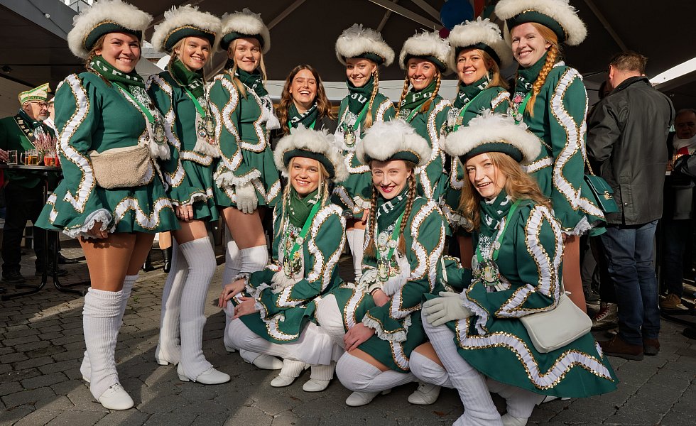 Rheda-Wiedenbrück feiert am Elften im Elften den Auftakt der neuen Karnevals-Session: Stadtprinzenpaar, Kinderprinzenpaar und alle Offiziellen haben sich rund um das Banner mit dem Motto der diesjährigen Session aufgestellt. Es lautet: Baustelle hin, Baustelle her – wir feiern dafür umso mehr!