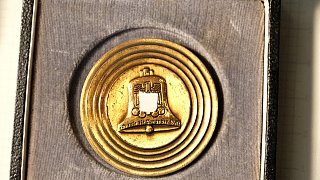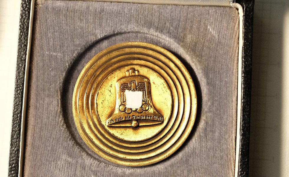 "Ich rufe die Junge der Welt", steht auf der Bronzemedaille von den Olympischen Spiele 1936. Das SS-Zeichen ist abgeklebt.