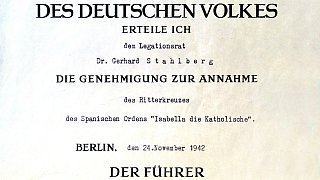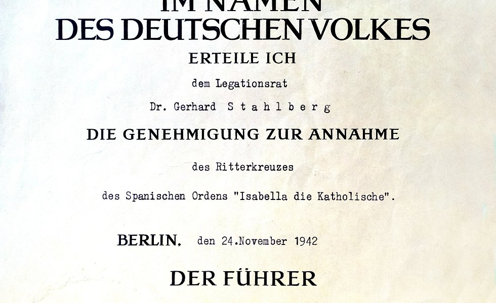 Diese von Adolf Hitler unterschriebene Urkunde ermächtigt zum Tragen des Ordes Isabellsa der Katholischen.