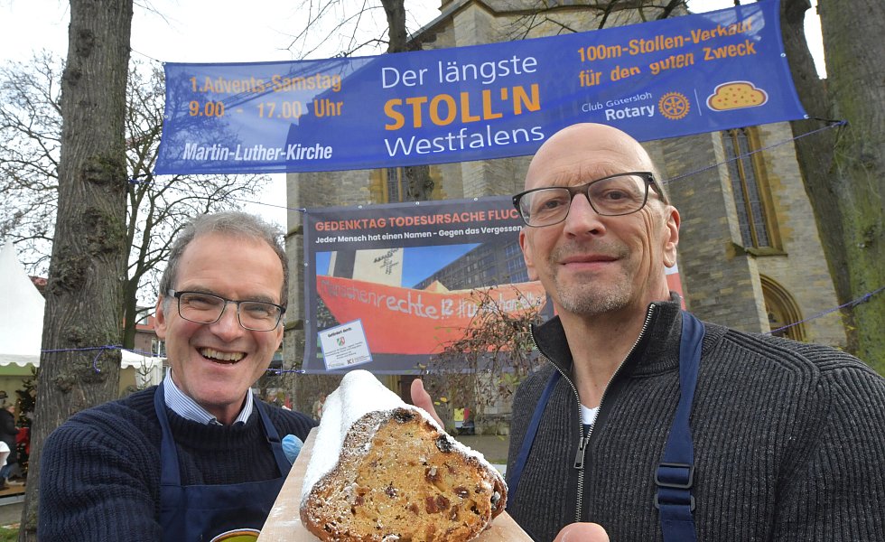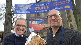 120 Meter Stollen brachten die Mitglieder des Rotary Clubs Gütersloh um Präsident Jens Berfelde (rechts) und Peter Kreutz am Samstag unter's Volk.