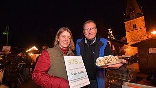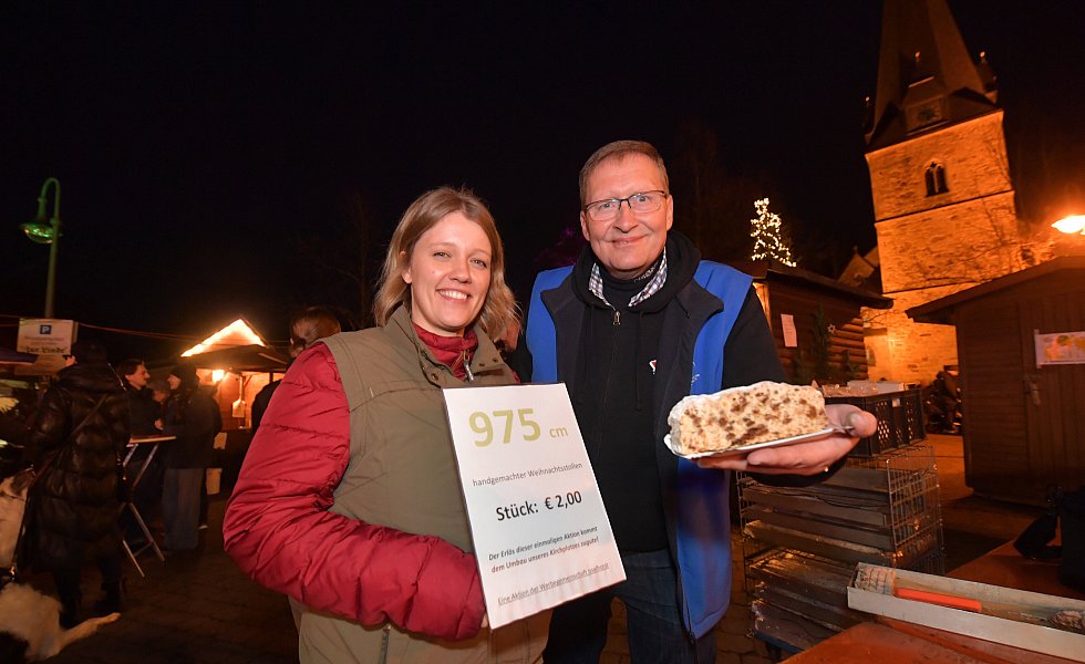 Aus Anlass der 975-Jahr-Feier verkaufte die Isselhorster Werbegemeinschaft um Svenja Eilts und Udo Plaßmann einen 9,75 Meter langen Stollen. Der Erlös ging an den Dorf- und Heimatverein zum Umbau des Kirchplatzes.