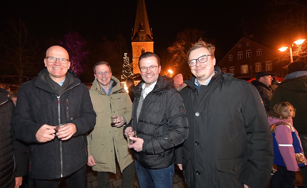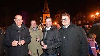 CDU-Bundestagsabgeordneter Ralph Brinkhaus (links), Stefan Bethlehem (SPD, 2ter v.L), CDU-Landtagsabgeordneter Raphael Tigges (3ter v.L) sowie CDU-Ratsherr Mario Blomberg bummelten einträchtig über den Isselhorster Weihnachtsmarkt.