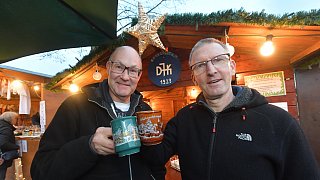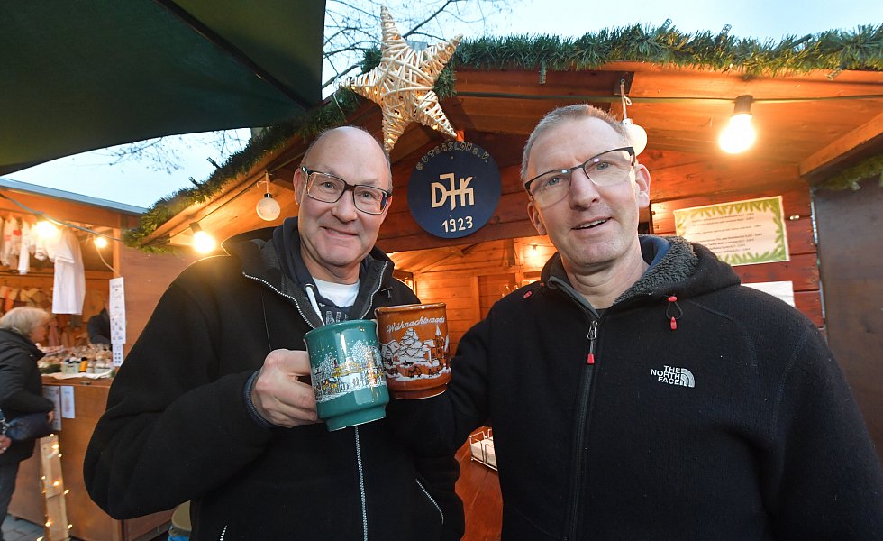 Christian Randerath (1. Vorsitzender DJK Gütersloh, links) und Ingo Scheumann (DJK GT) stießen auf einen erfolgreichen Kattenstrother Weihnachtsmarkt an.