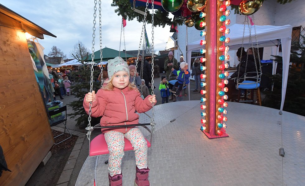 Mina (2) genoss die Fahrt im Kinderkarussell während des Kattenstrother Weihnachtsmarktes.