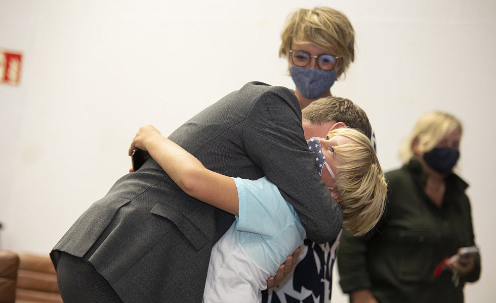 Sohn Jona umarmt seinen Vater Bernd Poggemöller.