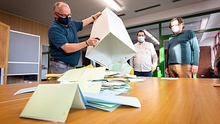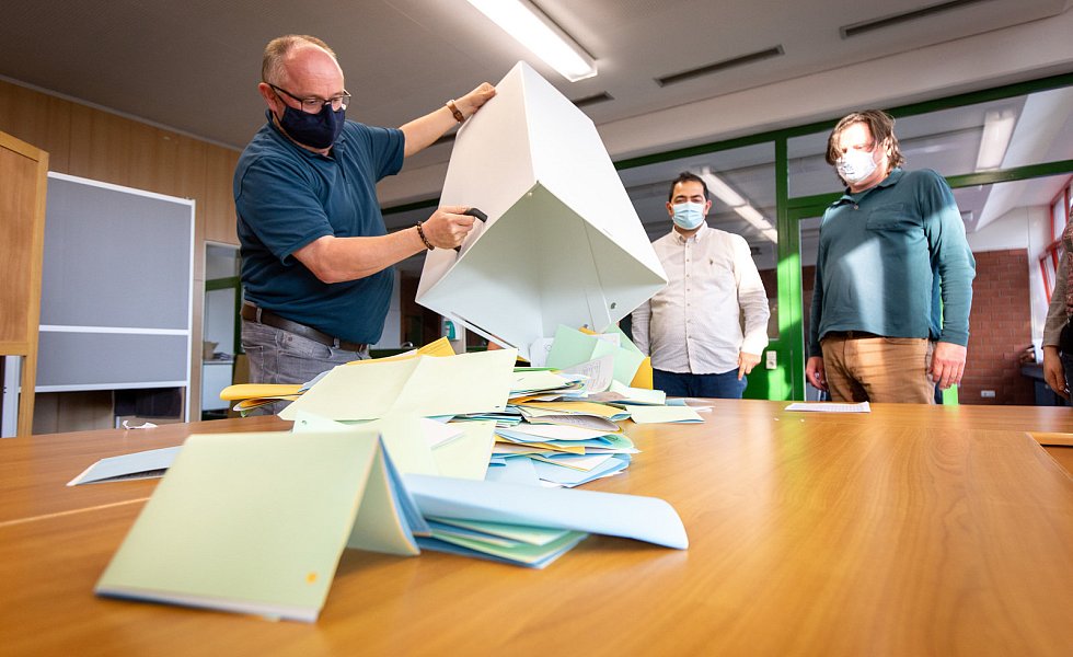 Im Wahllokal in der Goethe-Realschule zählen Oliver Schmidt (v.l.), Ramazan Selman und Sönke Petersen die Stimmzettel aus.