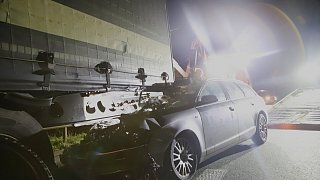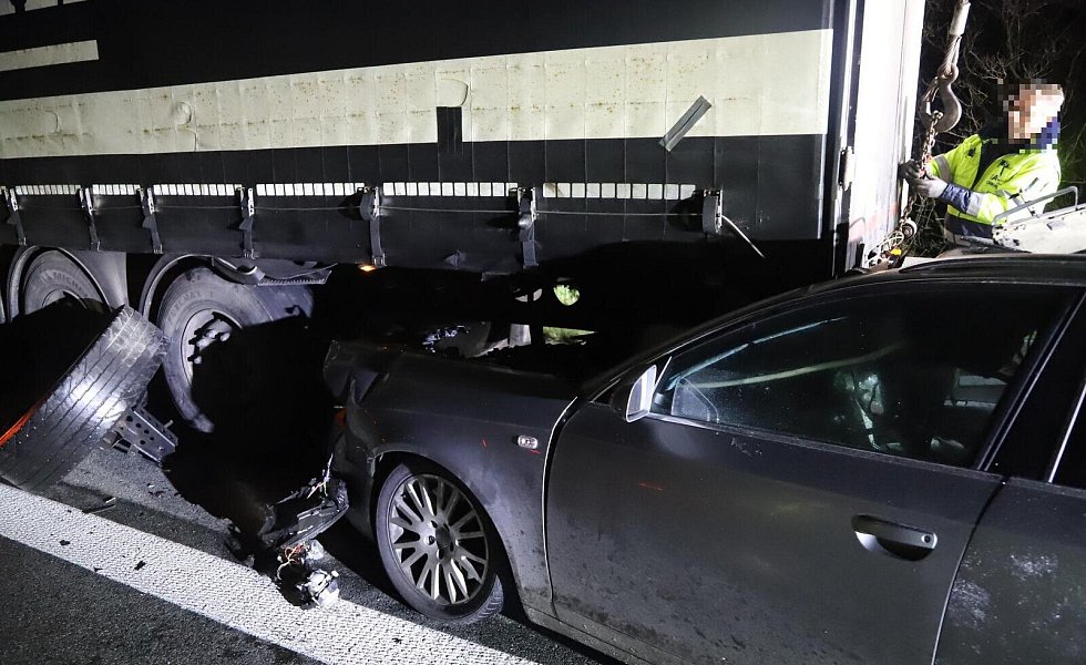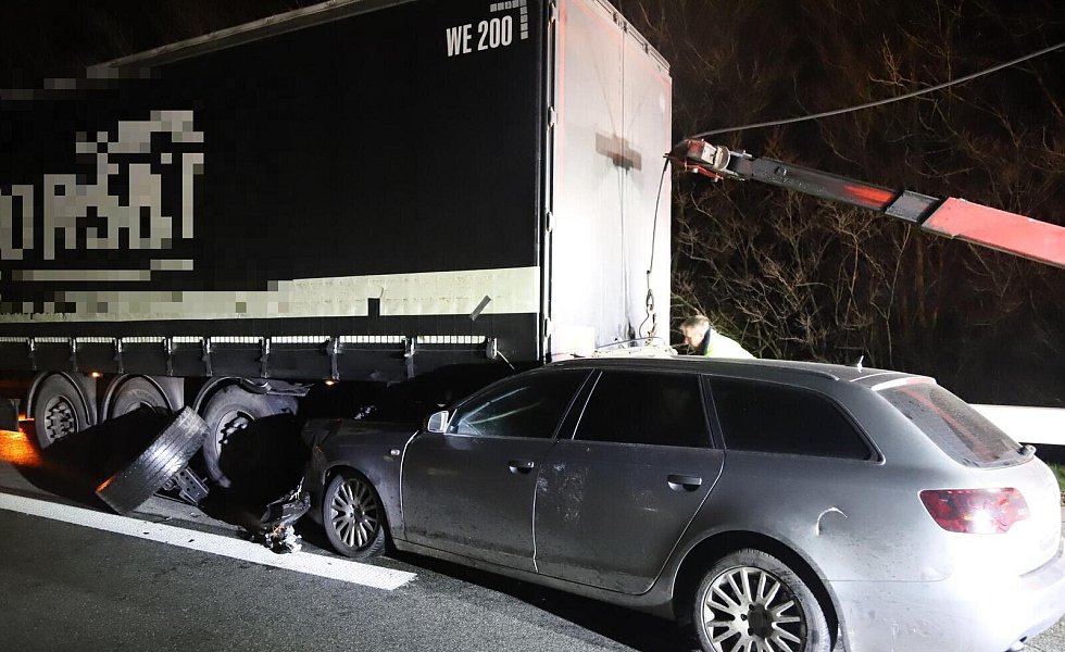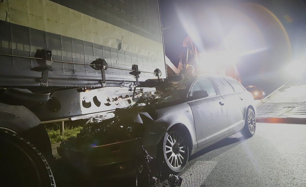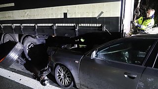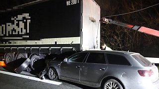 Das Auto hatte sich unter den Lastwagen geschoben.