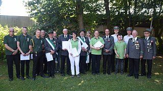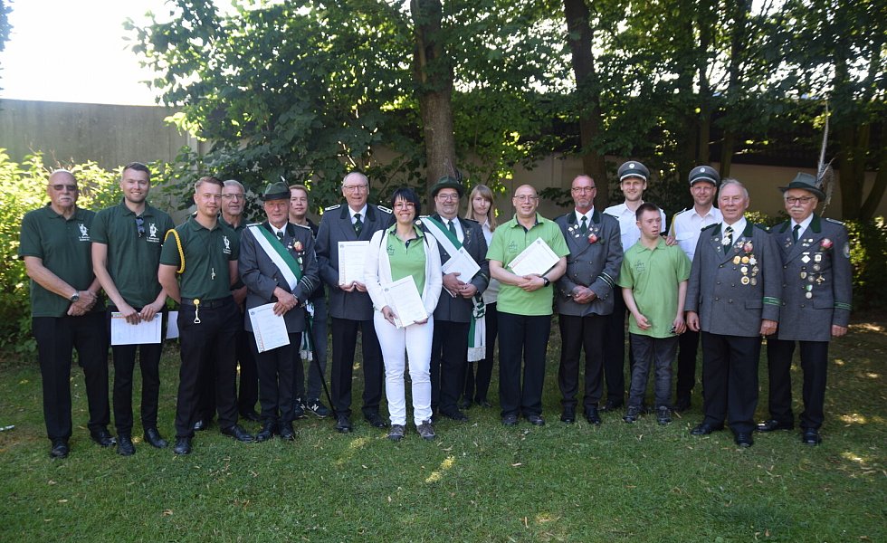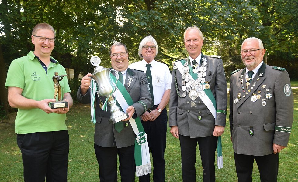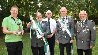 Hendrik Bäunker (v. l.) gewann den Wanderpokal des Ehrenrats, Kompanieführer Eike Pakendorf nahm stellvertretend für die dritte Kompanie den Wilhelm-Schröder-Pokal entgegen. Ausgezeichnet wurden aber auch Ralf Koch, Jürgen Uppenbrock und Dietmar Fischer.