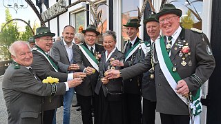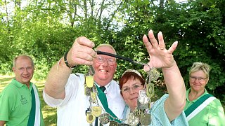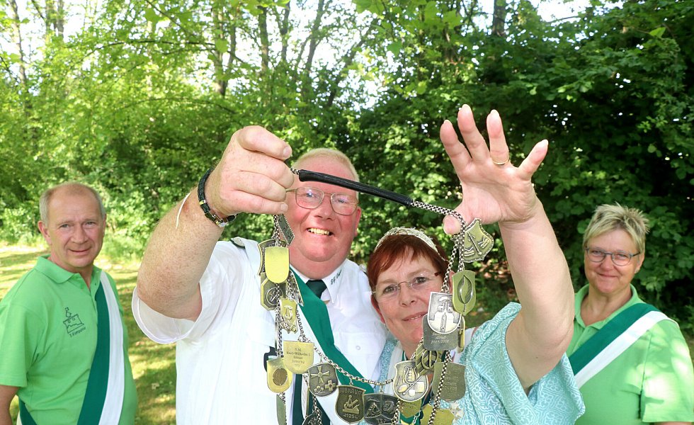 Die neuen Majestäten grüßen durch die Königskette: Sabine (I.) Grothaus und ihr Prinzgemahl Andreas. Der neuen Königin zur Seite stehen die Adjutantin Sabine und Adjutant Bernd Specht.