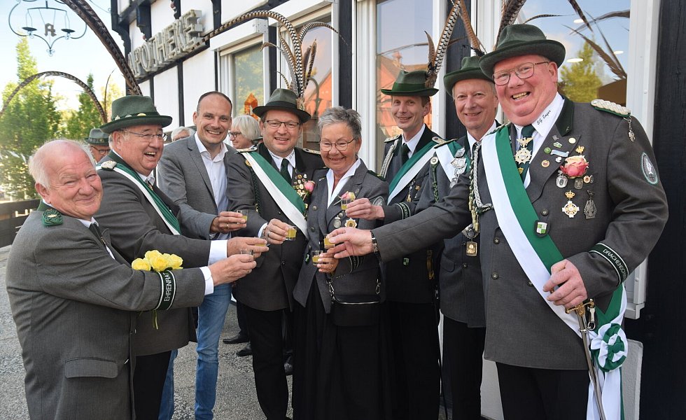 Stoßen mit dem Zielwasser an: Werner Brakensiek (v. l.), Oberst Hans-Hermann Ebmeyer, der stellvertretende Bürgermeister Philip Kleineberg, Frank Schlüter, Ute Fleer, Jan Sauerwald, Jürgen Uppenbrock und Major Andreas Grothaus.
