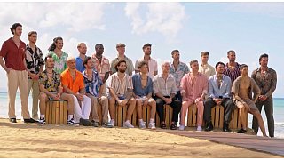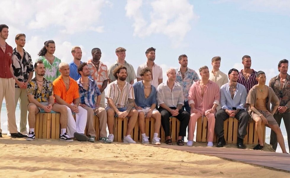 Diese 20 Männer sind bei der ersten Staffel von "FBoy Island" mit dabei. Zehn von ihnen sind nur wegen des Geldes dabei, die anderen suchen (angeblich) die große Liebe. Nach und nach kommen zudem immer mal wieder weitere Mitstreiter hinzu. Finn (2. v. l.) und Kenan (r.) geraten ins Visier von Lukas (vorne 3. v. r).