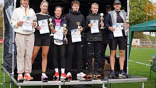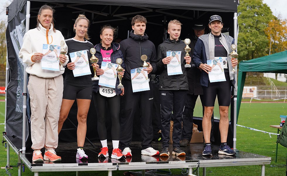 Die Siegerinnen und Sieger des TK-Firmenlaufs, Ann Katrin Corduan (v.l., 3.), Peggy Wolf (2.), Birte Bobe (1.), Alex Frank (3.), Tobias Tonn (2.), Mike Strohfeld (1.)